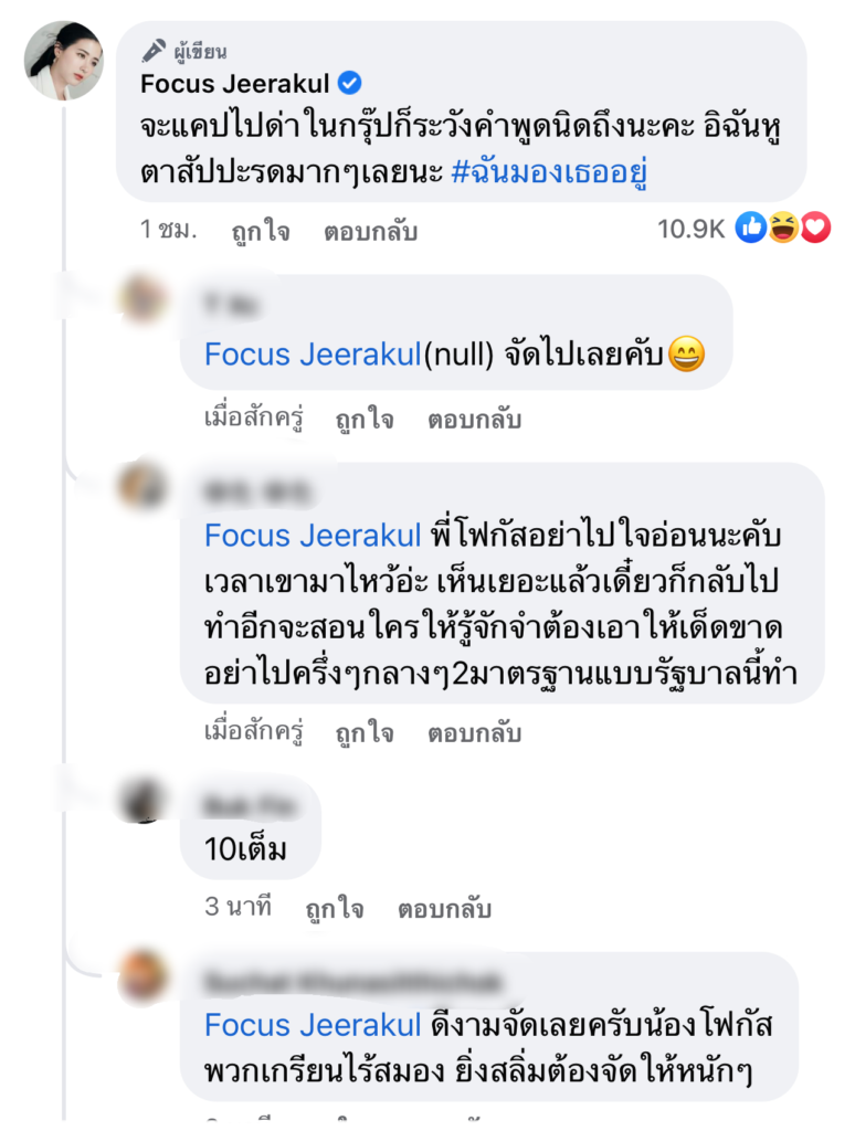 นอกจากนี้สาวโฟกัสยังได้เขียนใต้คอมเมนต์อีกว่า“จะแคปไปด่าในกรุ๊ปก็ระวังคำพูดนิดถึงนะคะอิฉันหูตาสับปะรดมากๆเลยนะ #ฉันมองเธออยู่” และ “ดิฉันประกวดมารยาทมาก่อน พอจะรู้ว่าหลักการไหว้อย่างถูกต้องนั้น ไหว้อย่างไรนะคะ”
