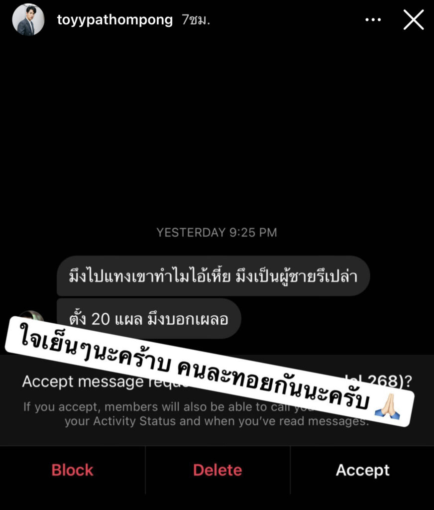 นักแสดงวัยรุ่น “ทอย ปฐมพงศ์“โพสต์ผ่านไอจีสตอรี่ลั่นใจเย็นหลังโดนทักแชทด่าว่าแทงแฟนสาวดับ ยันคนละคนกัน