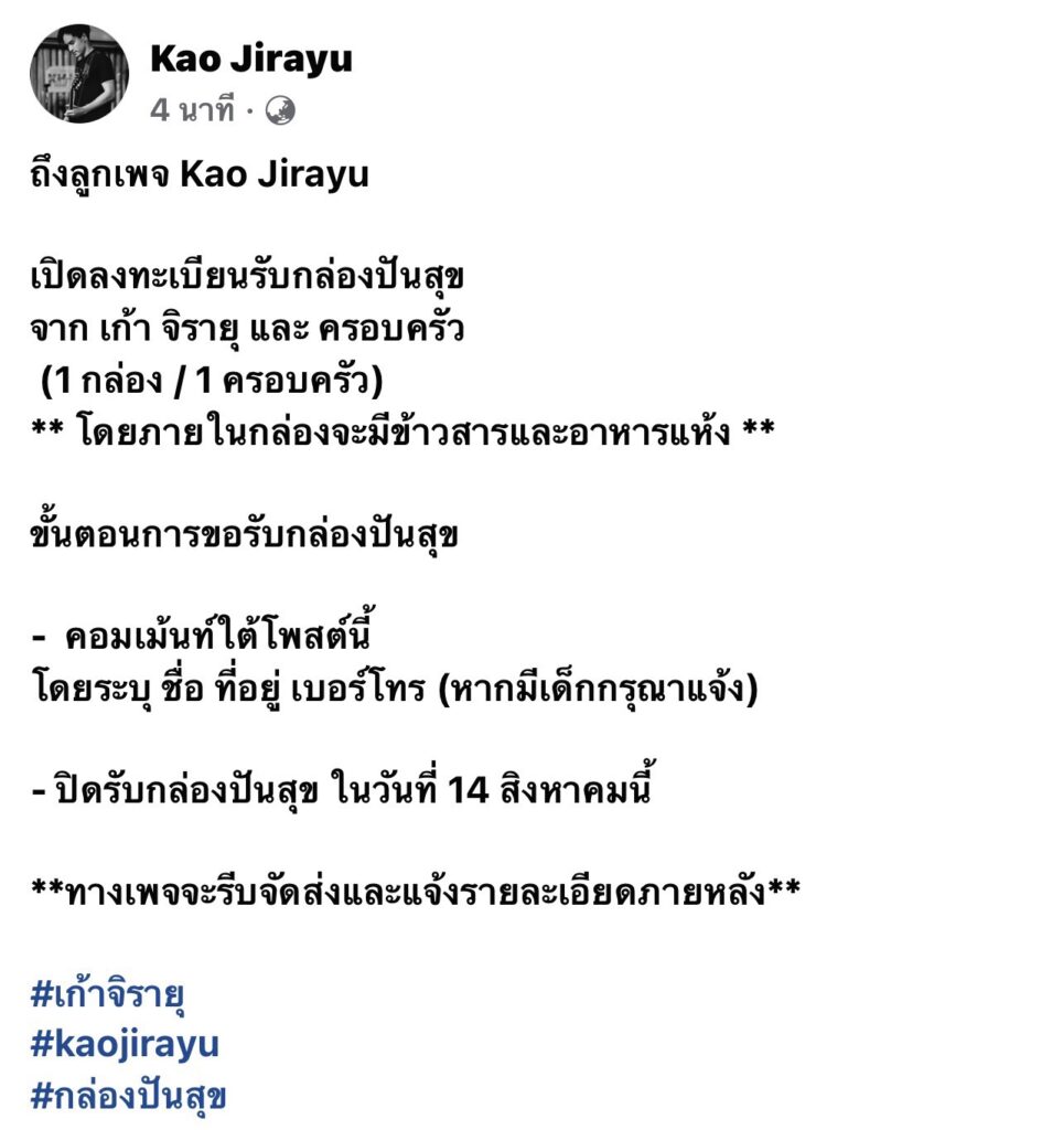 เก้า จิรายุ ตั้งงบส่วนตัว 1 ล้านบาท ส่งกำลังใจไปในรูปแบบของกล่องปันสุข