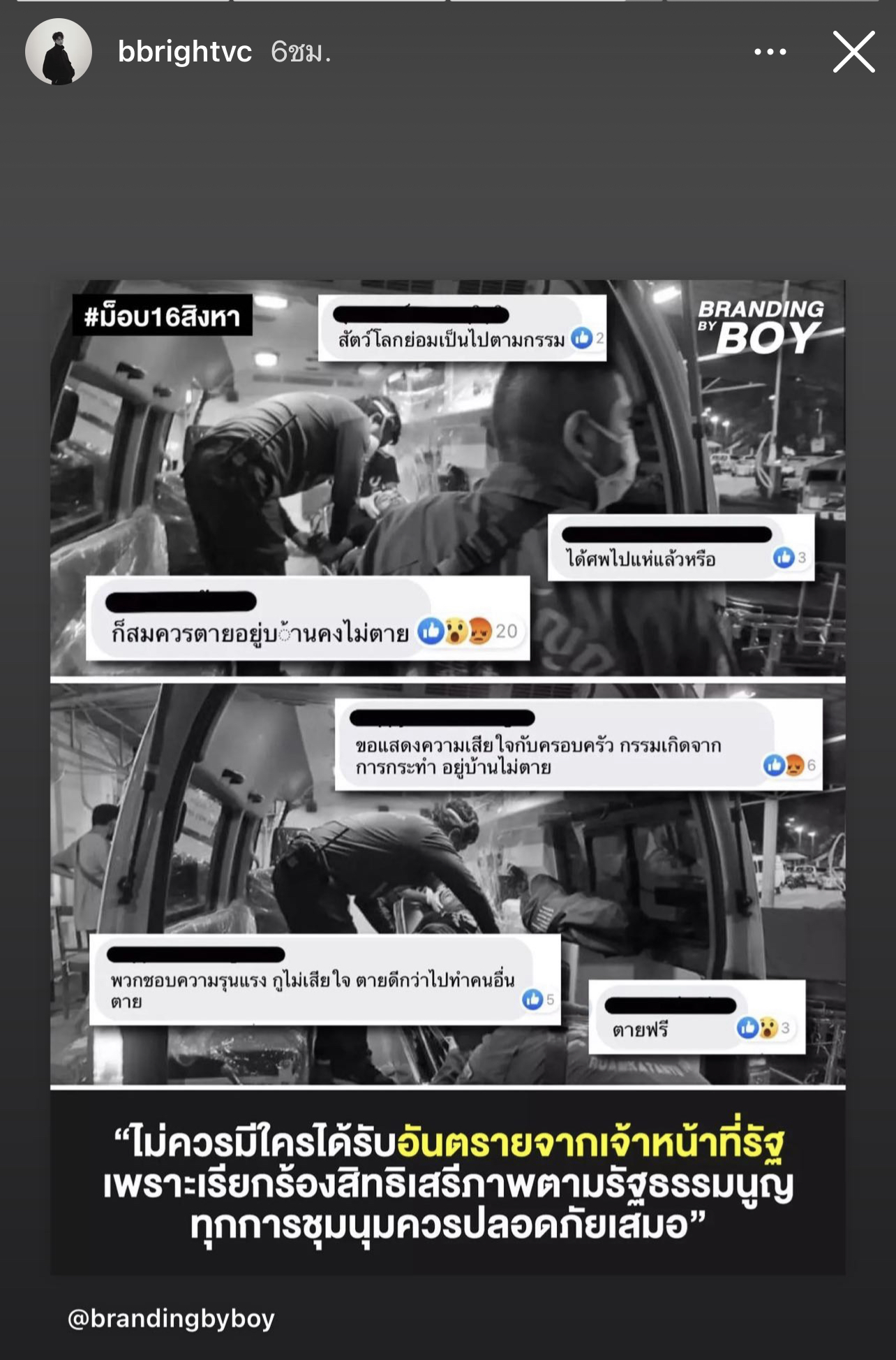 ซึ่งหนุ่มไบร์ทได้โพสต์ภาพลงในไอจีสตอรี่ เป็นภาพขาวดำที่กำลังปฐมพยาบาลคนเจ็บอยู่ในรถพร้อมกับเขียนข้อความข้างล่างว่า “ไม่ควรมีใครได้รับอันตรายจากเจ้าหน้าที่รัฐ เพราะเรียกร้องสิทธิเสรีภาพตามรัฐธรรมนูญ ทุกการชุมนุมควรปลอดภัยเสมอ“