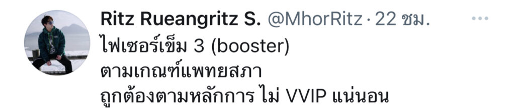 ล่าสุดเจ้าตัวได้โพสต์ภาพขณะรอฉีดวัคซีนพร้อมเขียนข้อความว่า“ไฟเซอร์เข็ม 3 (booster)ตามเกณฑ์แพทยสภา ถูกต้องตามหลักการ ไม่ VVIP แน่นอน“