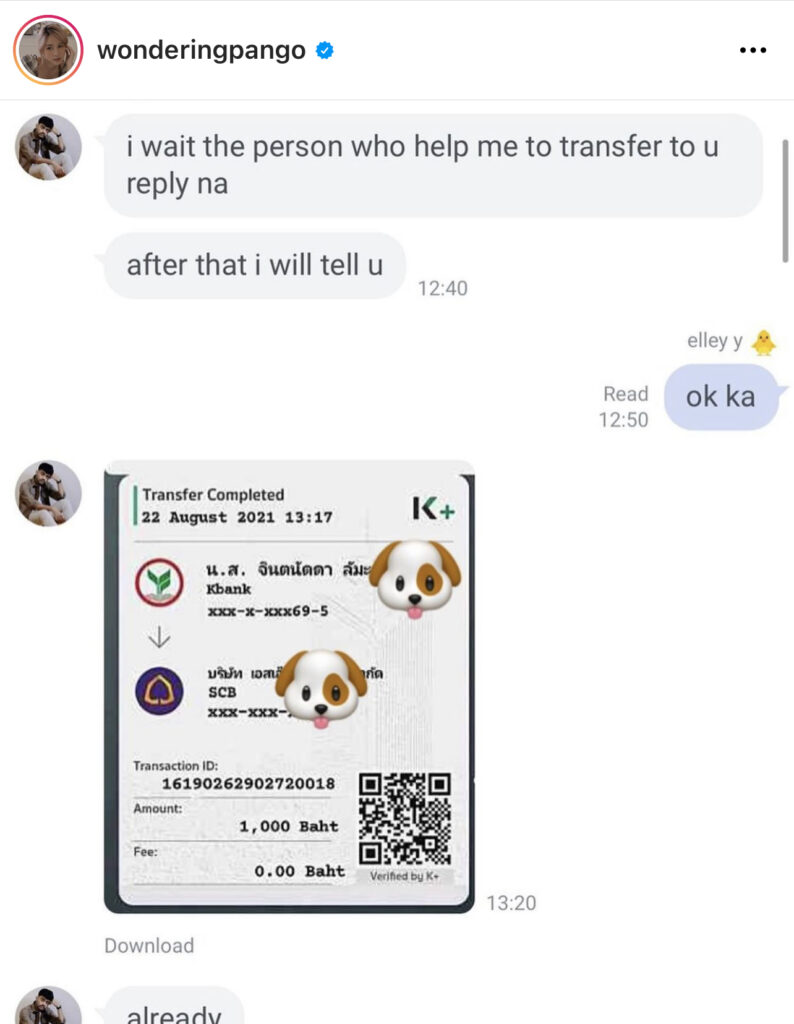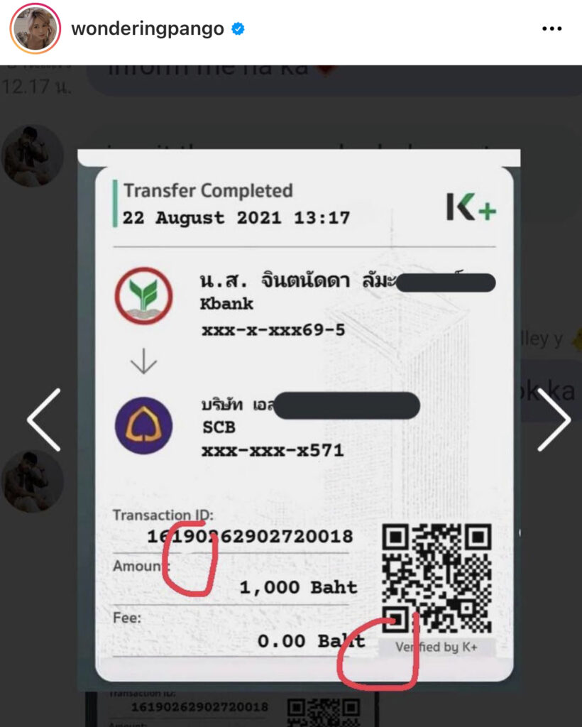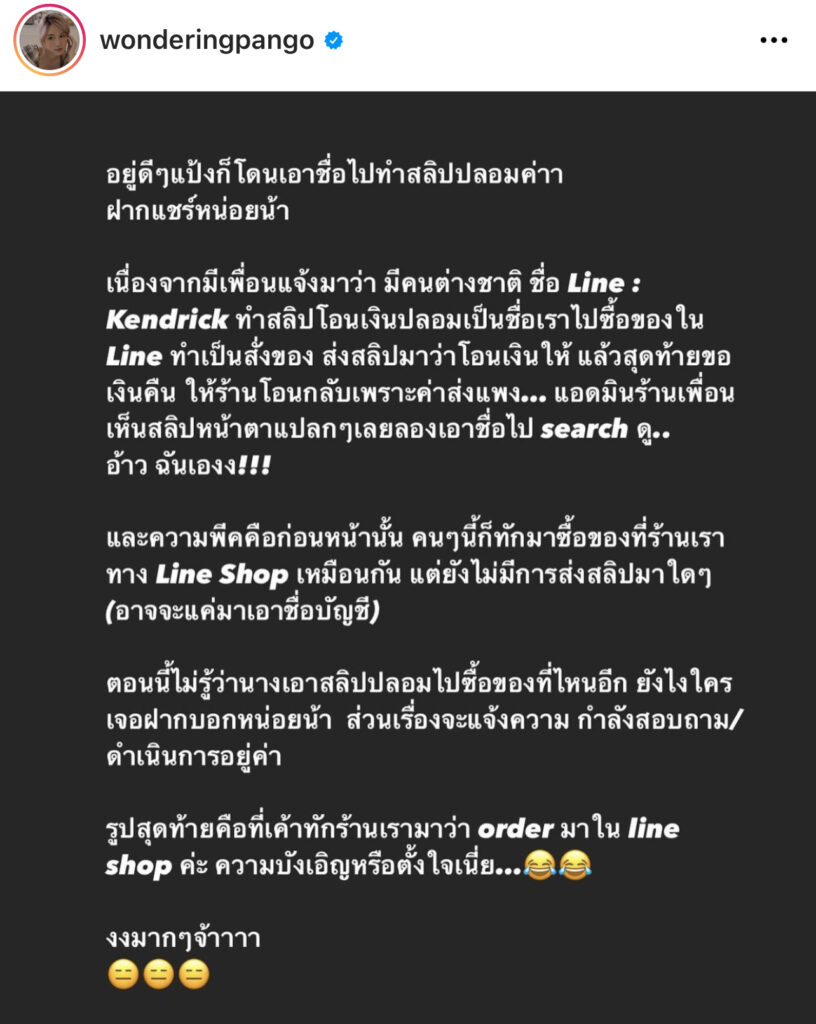 ทั้งนี้ยังได้เขียนแคปชั่นว่า “เราโดนเอาชื่อ–นามสกุล ไปแอบอ้างทำสลิปปลอมค่าา ฝากแชร์หน่อยน้า หรือร้านไหนเคยโดนคนนี้ทักไป ฝากบอกหน่อยค่า ขอยืนยันว่าไม่ใช่เรานะ ไม่เคยรับโอนเงินให้ใคร (แต่เอาจริงนางไม่เนียนเลย)