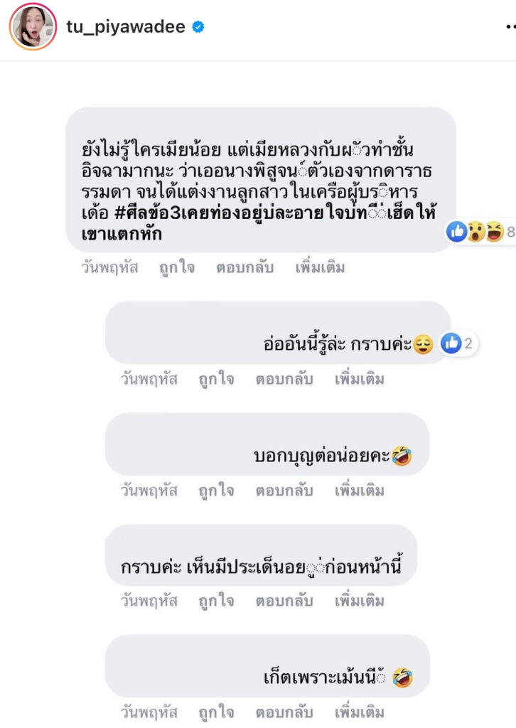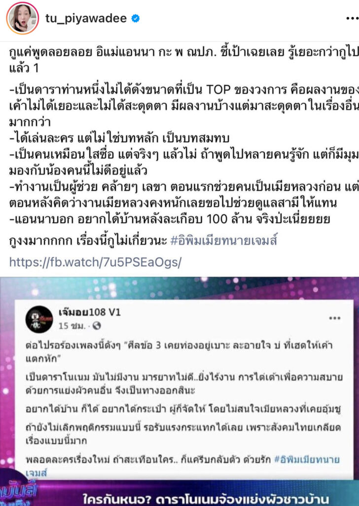 งานเข้าแบบงงๆสำหรับผู้จัดมือดี “ตู่ ปิยวดี มาลีนนท์“กับสามีหนุ่ม “มาวิน ทวีผล” หลังถูกโยงว่าเป็นดาราโนเนม จ้องแย่งสามีคนอื่นโดยเพจดัง เจ๊มอย 108 V1 ได้ออกมาโพสต์ข้อความคำไบ้ปริศนาว่า “ต่อไปร้องเพลงนี้ดังๆ ศีลข้อ 3 เคยท่องอยู่เบาะ ละอายใจ บ่ ที่เฮดให้เค้าแตกหัก เป็นดาราโนเนม มันไม่มีงาน มารยาทไม่ดี..ยิ่งไร้งาน การไต่เต้าเพื่อความสบาย ด้วยการแย่งผัวคนอื่น จึงเป็นทางออกสินะ