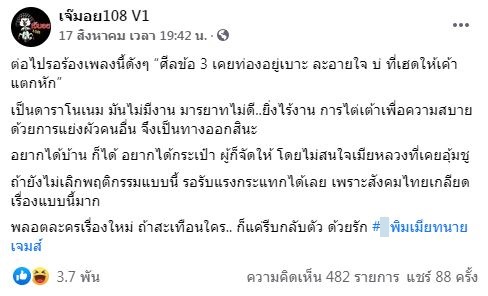 อยากได้บ้าน ก็ได้ อยากได้กระเป๋าผู้ก็จัดให้ โดยไม่สนใจเมียหลวงที่เคยอุ้มชูถ้ายังไม่เลิกพฤติกรรมแบบนี้ รอรับแรงกระแทกได้เลย เพราะสังคมไทยเกลียดเรื่องแบบนี้มาก พลอตละครเรื่องใหม่ ถ้าสะเทือนใคร.. ก็แค่รีบกลับตัว ด้วยรัก#พิมเมียทนายเจมส์“