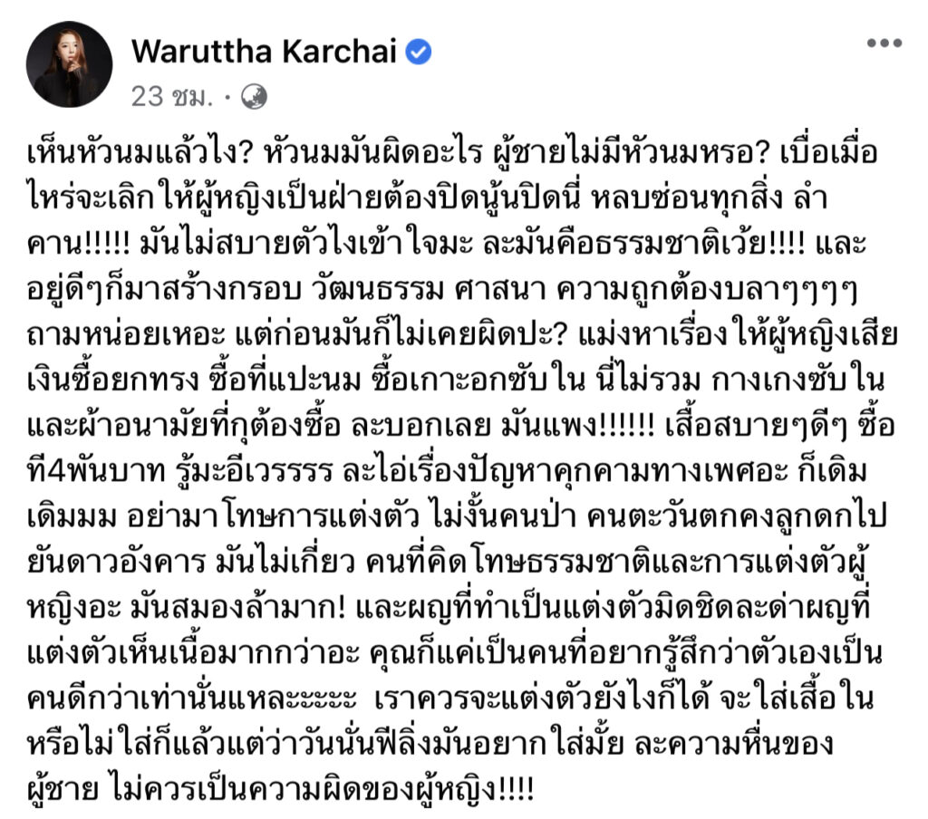 “เห็นหัวนมแล้วไง? หัวนมมันผิดอะไร ผู้ชายไม่มีหัวนมหรอ? เบื่อเมื่อไรจะเลิกให้ผู้หญิงเป็นฝ่ายต้องปิดนู่นปิดนี่ หลบซ่อนทุกสิ่ง รำคาญ!!!!! มันไม่สบายตัวไงเข้าใจไหม แล้วมันคือธรรมชาติเว้ย!!!! และอยู่ดีๆก็มาสร้างกรอบ วัฒนธรรมศาสนา ความถูกต้อง บลาๆๆๆๆ ถามหน่อยเหอะ แต่ก่อนมันก็ไม่เคยผิดปะ? แม่งหาเรื่องให้ผู้หญิงเสียเงินซื้อยกทรงซื้อที่แปะนม ซื้อเกาะอกซับใน นี่ไม่รวมกางเกงซับใน และผ้าอนามัยที่กูต้องซื้อ แล้วบอกเลย มันแพง!!!!!! เสื้อสบายๆดีๆ ซื้อที 4 พันบาท รู้ไหมอีเวรรรร แล้วไอ้เรื่องปัญหาคุกคามทางเพศอะ ก็เดิมเดิมมม อย่ามาโทษการแต่งตัว ไม่งั้นคนป่า คนตะวันตกคงลูกดกไปยันดาวอังคาร มันไม่เกี่ยว คนที่คิดโทษธรรมชาติ และการแต่งตัวผู้หญิงอะ มันสมองล้ามาก! และผู้หญิงที่ทำเป็นแต่งตัวมิดชิดแล้วด่าผู้หญิงที่แต่งตัวเห็นเนื้อมากกว่าอะ คุณก็แค่เป็นคนที่อยากรู้สึกว่าตัวเองเป็นคนดีกว่าเท่านั่นแหละะะะะ เราควรจะแต่งตัวอย่างไรก็ได้ จะใส่เสื้อใน หรือไม่ใส่ก็แล้วแต่ว่าวันนั้นฟีลลิ่งมันอยากใส่ไหม แล้วความหื่นของผู้ชาย ไม่ควรเป็นความผิดของผู้หญิง!!!!”