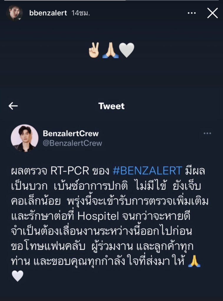 โดยจะทำการตรวจเพิ่มเติมซึ่งทางหนุ่มเบ้นซ์ได้แจ้งข่าวผ่านทางทวิตเตอร์และไอจีสตอรี่ส่วนตัวว่า” ผลตรวจ RT-PCR ของ #BENZALERT มีผลเป็นบวก เบ้นซ์อาการปกติ ไม่มีไข้ ยังเจ็บคอเล็กน้อย พรุ่งนี้จะเข้ารับการตรวจเพิ่มเติม และรักษาต่อที่ Hospitel จนกว่าจะหายดี จำเป็นต้องเลื่อนงานระหว่างนี้ออกไปก่อน ขอโทษแฟนคลับ ผู้ร่วมงาน และลูกค้าทุกท่าน และขอบคุณทุกกำลังใจที่ส่งมาให้ ”