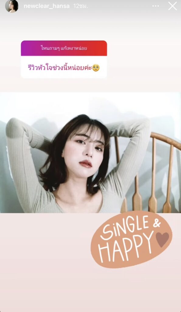 ล่าสุด สาวนิวเคลียร์ ได้มีการเล่น Q&A ในสตอรี่ไอจีส่วนตัว โดยเปิดให้แฟนคลับถามอะไรก็ได้ แล้วเจ้าตัวจะเป็นคนตอบ ซึ่งก็มีหนึ่งคำถาม อยากให้สาวนิวเคลียร์ รีวิวหัวใจช่วงนี้หน่อย โดยเธอตอบมาว่า SINGLE&HAPPY(แฮปปี้โสด) และก็มีอีกหนึ่งคำถาม