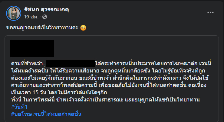 ขณะนี้ข้าพเจ้า สำนึกผิดในการกระทำดังกล่าว จึงได้ชดใช้ค่าเสียหายและทำการโพสต์ข้อความนี้ เพื่อขออภัยไปยังเจนนี่ได้หมดถ้าสดชื่น ต่อเนื่องเป็นเวลา 15 วัน โดยไม่มีการโต้แย้งใดๆ อีกทั้งนี้ ในการโพสต์นี้ ข้าพเจ้าจะตั้งค่าเป็นสาธารณะ และอนุญาตให้แชร์เป็นวิทยาทาน