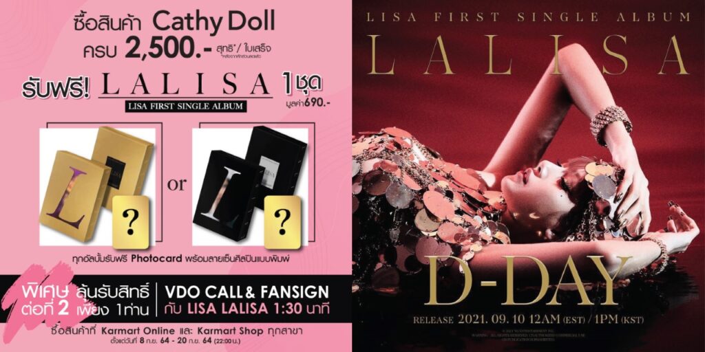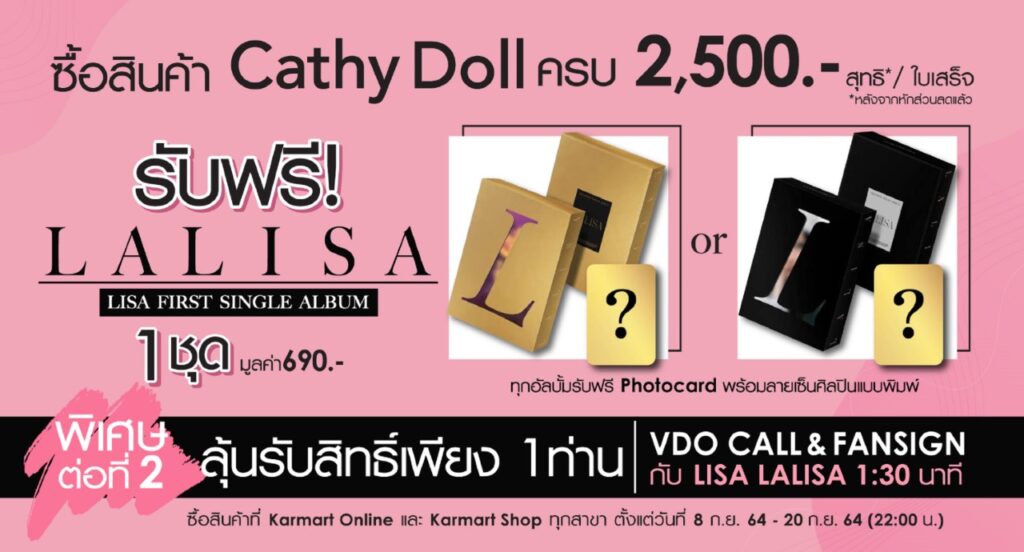 เคที่ดอลล์ (Cathy Doll) จัดโปรโมชั่นสุดปังให้ลูกค้าได้ลุ้นใกล้เห็นหน้า VDO CALL & FANSIGN ไปกับ “ลิซ่า” ตัวจริงเสียงจริง ยิ่งซื้อเยอะ ยิ่งมีสิทธิ์ลุ้นเยอะ!!! เพียง 1 คนเท่านั้นที่จะได้ VDO CALL FANSIGN เพียงซื้อสินค้า Cathy Doll ครบทุกๆ 2,500 บาท/ใบเสร็จ (ยอดสุทธิหลังหักส่วนลด) รับฟรีทันที “LISA FIRST SINGLE ALBUM LALISA” 1 ชุด มูลค่า 690 บาท (มีจำนวนจำกัดเพียง 3,000 ชุด**) โดยสามารถเลือก LALISA CD Gold / Black ได้บริษัทฯ ขอสงวนสิทธิ์ในการเลือกสีอัลบั้มหากสีใดหมดก่อน และทุกๆอัลบั้มจะได้รับ Photo card ขนาด 5.5cm x 8.5cm พร้อมลายเซ็นศิลปินแบบพิมพ์