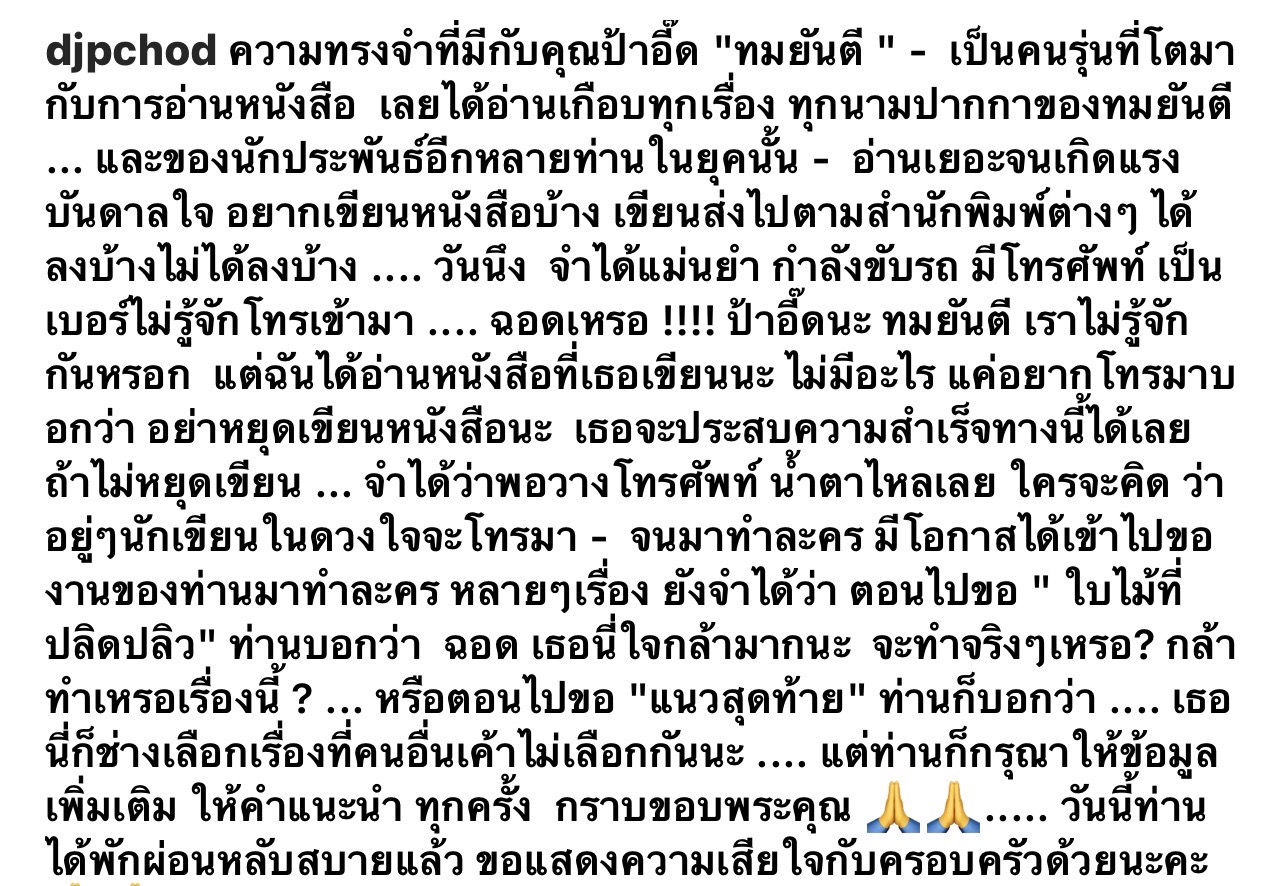@djpchod ความทรงจำที่มีกับคุณป้าอี๊ด “ทมยันตี ” –เป็นคนรุ่นที่โตมากับการอ่านหนังสือเลยได้อ่านเกือบทุกเรื่องทุกนามปากกาของทมยันตี … และของนักประพันธ์อีกหลายท่านในยุคนั้น –อ่านเยอะจนเกิดแรงบันดาลใจ อยากเขียนหนังสือบ้าง เขียนส่งไปตามสำนักพิมพ์ต่างๆ ได้ลงบ้างไม่ได้ลงบ้าง …. วันนึงจำได้แม่นยำ กำลังขับรถ มีโทรศัพท์ เป็นเบอร์ไม่รู้จักโทรเข้ามา …. ฉอดเหรอ !!!! ป้าอี๊ดนะ ทมยันตี เราไม่รู้จักกันหรอกแต่ฉันได้อ่านหนังสือที่เธอเขียนนะ ไม่มีอะไร แค่อยากโทรมาบอกว่า อย่าหยุดเขียนหนังสือนะเธอจะประสบความสำเร็จทางนี้ได้เลยถ้าไม่หยุดเขียน … จำได้ว่าพอวางโทรศัพท์ น้ำตาไหลเลย ใครจะคิด ว่าอยู่ๆนักเขียนในดวงใจจะโทรมา –จนมาทำละคร มีโอกาสได้เข้าไปของานของท่านมาทำละคร หลายๆเรื่อง ยังจำได้ว่า ตอนไปขอ ” ใบไม้ที่ปลิดปลิว” ท่านบอกว่าฉอดเธอนี่ใจกล้ามากนะจะทำจริงๆเหรอ? กล้าทำเหรอเรื่องนี้ ? … หรือตอนไปขอ “แนวสุดท้าย” ท่านก็บอกว่า …. เธอนี่ก็ช่างเลือกเรื่องที่คนอื่นเค้าไม่เลือกกันนะ …. แต่ท่านก็กรุณาให้ข้อมูลเพิ่มเติม ให้คำแนะนำ ทุกครั้งกราบขอบพระคุณ🙏🙏….. วันนี้ท่านได้พักผ่อนหลับสบายแล้ว ขอแสดงความเสียใจกับครอบครัวด้วยนะคะ 🙏🙏
