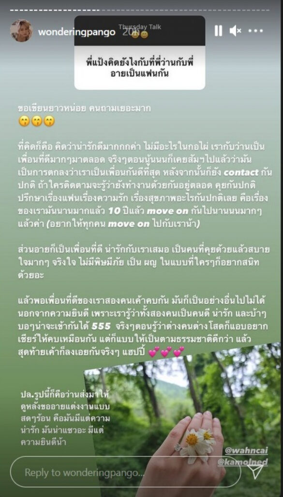 “ขอเขียนยาวหน่อย คนถามเยอะมากที่คิดคือ คิดว่าน่ารักดีมากค่ะ ไม่มีอะไรในกอไผ่ เรากับว่านเป็นเพื่อนที่ดีมากๆมาตลอด จริงๆ ตอนนู้นก็เคยสัมภาษณ์ไปแล้ว มันเป็นการตกลงว่าเราเป็นเพื่อนกันดีที่สุด หลังจากนั้นก็ยังติดต่อกันปกติ ถ้าใครติดตามจะรู้ว่ายังทำงานด้วยกันอยู่ตลอด คุยกันปกติปรึกษาเรื่องแฟนเรื่องความรัก เรื่องสุขภาพอะไรกันปกติเลย คือเรื่องของเรามันนานมากแล้ว 10 ปีแล้วมูฟออนกันไปนานมากๆ แล้วคะ (อยากให้ทุกคนมูฟออนไปกับเรานะ)