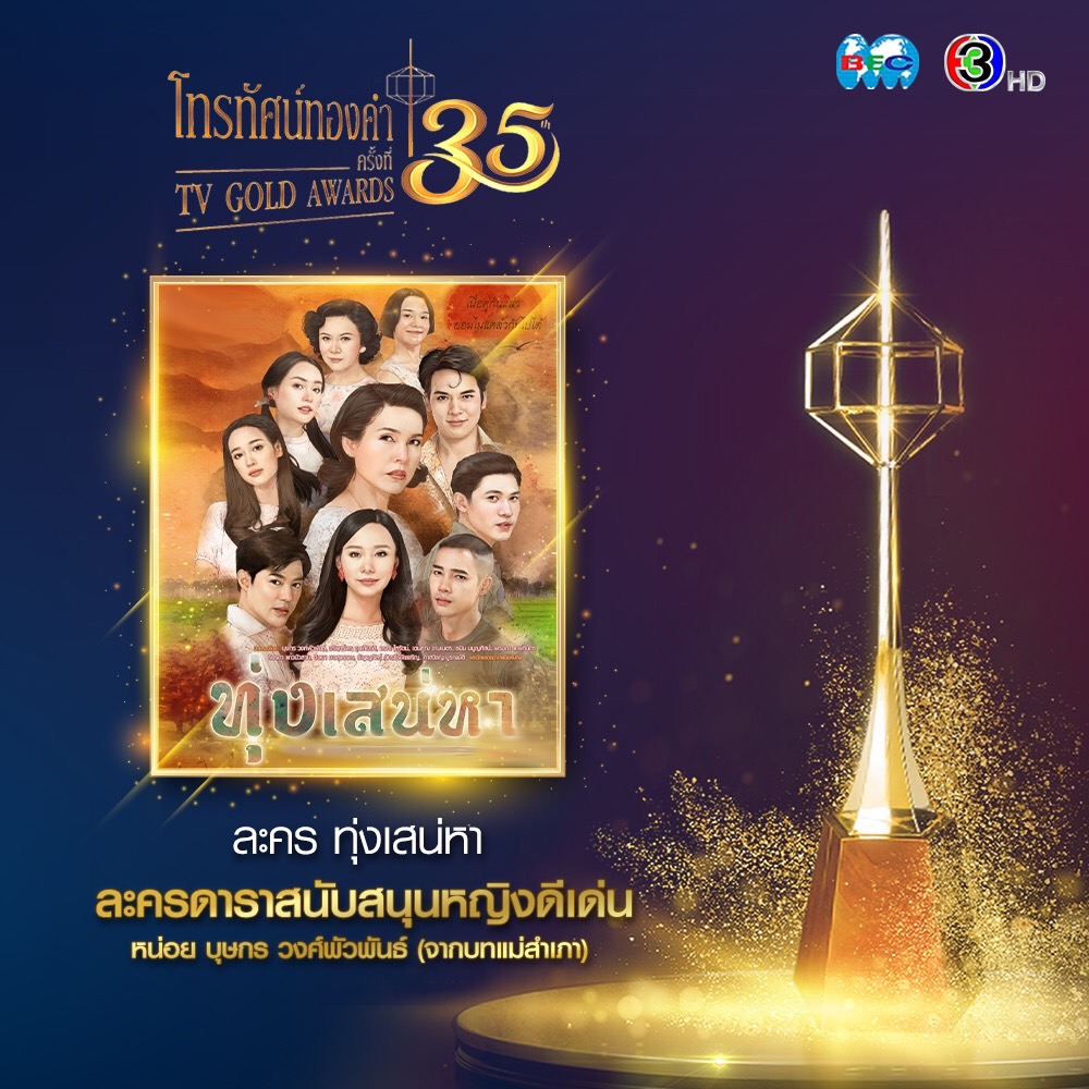 ขอแสดงความยินดีกับผลการประกาศรางวัลโทรทัศน์ทองคำ ครั้งที่ 35 ประจำปี 2563 ภายใต้ชื่อ “ร่วมร้อยดวงใจ สู่วิถีใหม่คนทีวี” จัดโดย ชมรมส่งเสริมโทรทัศน์และมูลนิธิจำนง รังสิกุล ร่วมกับ กระทรวงวัฒนธรรม และ กองทุนพัฒนาสื่อปลอดภัยและสร้างสรรค์ คืนวันศุกร์ที่ 17 กันยายน 2564 ทาง พีพีทีวี เอชดี ช่อง 36 มอบรางวัลแห่งกำลังใจของคนบันเทิงทั้งเบื้องหน้าและเบื้องหลัง ให้ “หน่อย บุษกร วงศ์พัวพันธ์” รับรางวัลดาราสนับสนุนหญิงดีเด่น จากละคร “ทุ่งเสน่หา” (ในบทแม่สำเภา) ผลงานของบริษัท กู๊ดฟีลลิ่ง โดย “คิง สมจริง ศรีสุภาพ” และ ละคร “ดั่งดวงหฤทัย” ผลงานของบริษัท ฮูแอนด์ฮู จำกัด โดย “ไก่ วรายุฑ มิลินทจินดา” คว้ารางวัลองค์ประกอบศิลป์ดีเด่น ประจำปี 2563