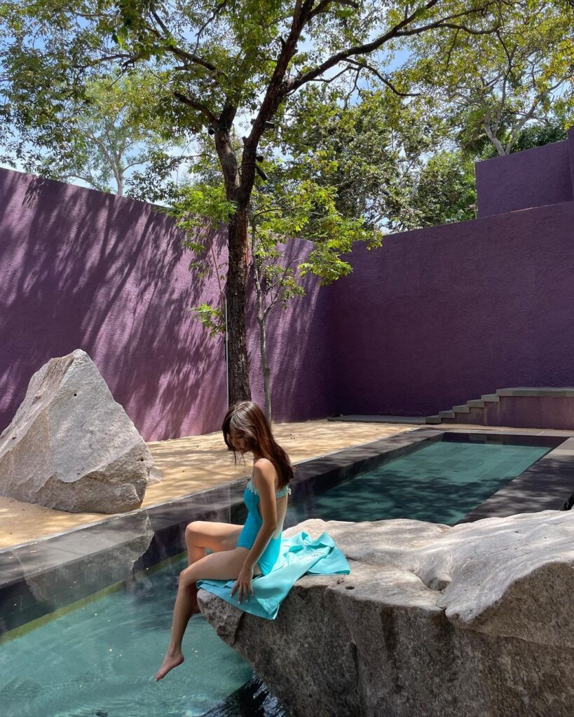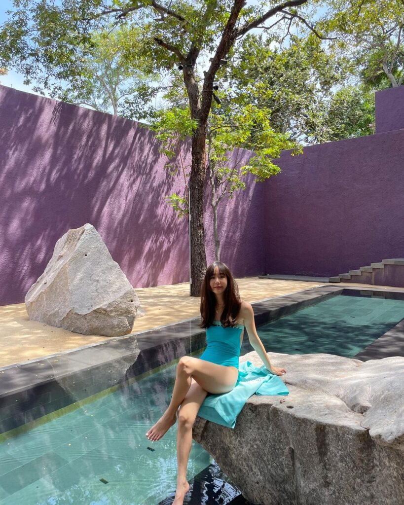 มีทั้งชุดทูพีซสีฟ้าสดใสและชุดวันพีซที่เธอนั่งโพสท่าสวยๆ อยู่ริมสระ เห็นลุคน่ารักๆกันมาเยอะ พอได้เห็นลุคเซ็กซี่บอกเลยว่าทั้งสวยน่ารักเซ็กซี่บาดใจสุดๆ