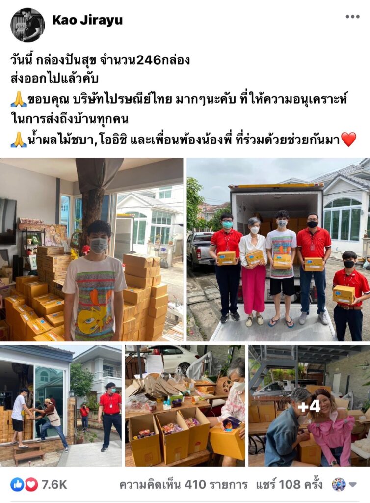 เข้าเดือนที่ 5 แล้วที่พระเอกหนุ่มเก้า จิรายุ ละอองมณี และครอบครัว ได้ขอส่งมอบพลังใจไปให้ผู้ที่เดือดร้อนจากโควิด-19 ทั่วประเทศ ในรูปแบบของกล่องปันสุขที่บรรจุอาหารแห้งแน่นสุดๆจนเต็มกล่อง เผื่อบรรเทาทุกข์สร้างรอยยิ้มให้กับทุกคนได้บ้างไม่มากก็น้อย โดยล่าสุด หนุ่มเก้า ก็ได้จัดส่งกล่องปันสุขไปอีก 246 กล่อง ซึ่งตอนนี้ก็ถึงมือของทุกคนเป็นที่เรียบร้อย งานนี้ หนุ่มเก้า ได้แย้มสั้นๆมาว่า ความสุขที่ได้ทำกล่องปันสุขนี้ขึ้นด้วยความตั้งใจ ก็เผื่อทำให้ทุกคนได้มีรอยยิ้มมีความสุขขึ้นมาบ้าง และผมขอเป็นกำลังใจให้ทุกคนเราจะผ่านวิกฤตครั้งนี้ไปด้วยกันครับ