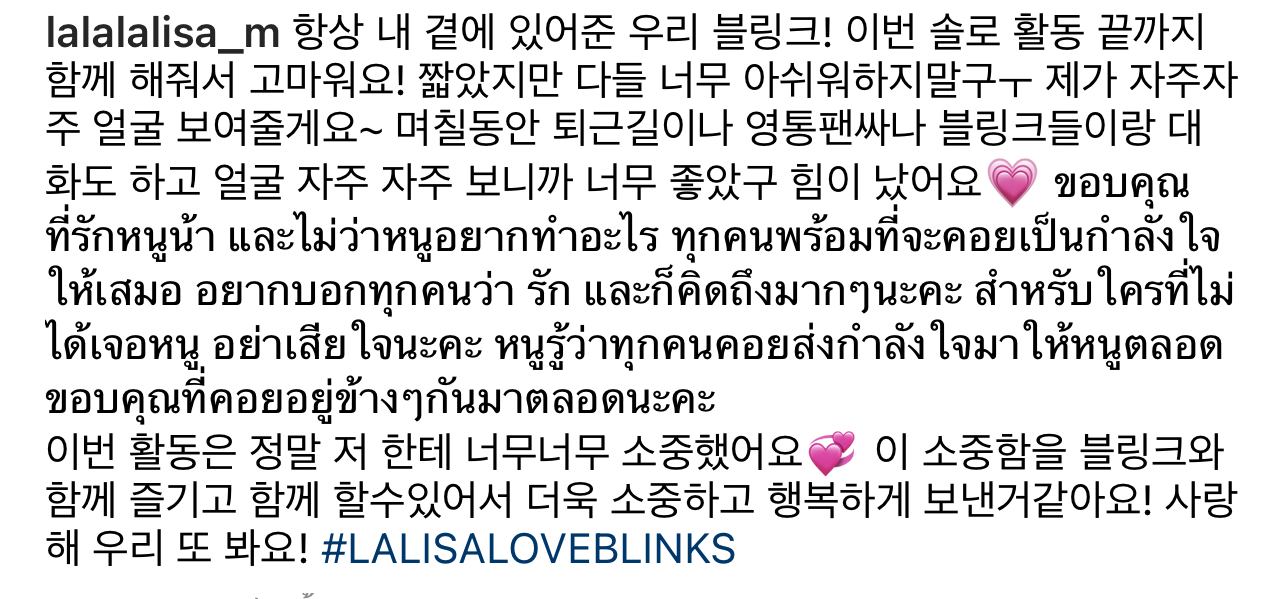 นักร้องเกาหลีสายเลือดไทยลิซ่า BLACKPINK”โพสต์ขอบคุณแฟนคลับที่รักหนู ลั่นไม่ต้องเสียใจที่ไม่ได้เจอ
