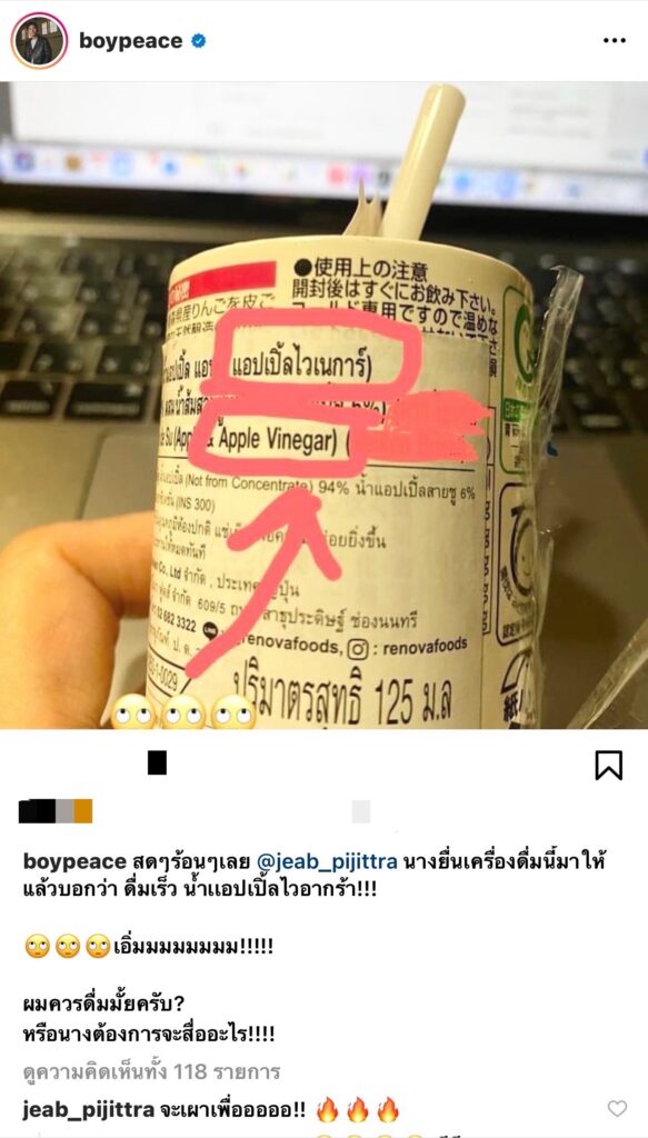 และล่าสุดเมื่อ สาวเจี๊ยบ แอบปล่อยไก่เบอร์ใหญ่ใส่ หนุ่มบอย ก็ไม่พลาดที่จะต้องเขียนลงบันทึกสิ่งเล็ก ๆ ที่เรียกว่ารอยยิ้มลงไว้ในอินสตราแกรมส่วนตัว พร้อมเขียนแคปชั่นกำกับว่า “สดๆร้อนๆเลย @jeab_pijittra นางยื่นเครื่องดื่มนี้มาให้ แล้วบอกว่า ดื่มเร็ว น้ำเเอปเปิ้ลไวอากร้า!!! 🙄🙄🙄เอิ่มมมมมมมม!!!!! ผมควรดื่มมั้ยครับ? หรือนางต้องการจะสื่ออะไร!!!! “
