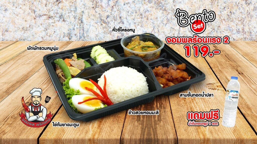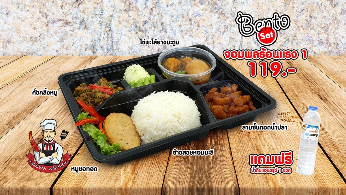 ร้านจอมพล พริกแกง เป็นร้านข้าวแกงโบราณที่มีรสชาติจัดจ้าน เป็นแนวอาหารใต้ที่มีสูตรลับเฉพาะตัว เอกลักษณ์สำคัญคือการใช้พริกแกงเป็นส่วนประกอบของอาหาร เมนู Bento Set แนะนำได้แก่ ‘จอมพลพะโล้ 1’ ภายในเซ็ตจัดให้แบบเต็มอิ่มจุใจ ข้าวสวยหอมมะลิ, สามชั้นทอดน้ำปลา, ไข่พะโล้ยางมะตูม, ผัดผักรวมหมูนุ่ม และหมูยอทอด หรือจะเป็นเซ็ต ‘จอมพลร้อนแรง 2’ กับข้าวสวยหอมมะลิ, สามชั้นทอดน้ำปลา,ไข่ต้มยางมะตูม, ผัดผักรวมหมูนุ่ม, คั่วซี่โครงหมู ทั้ง 2 เซ็ตมาแบบจุใจในราคาเพียง 119 บาทเท่านั้น แถมฟรีน้ำดื่มน้องแอนดรูว์อีก 1 ขวด