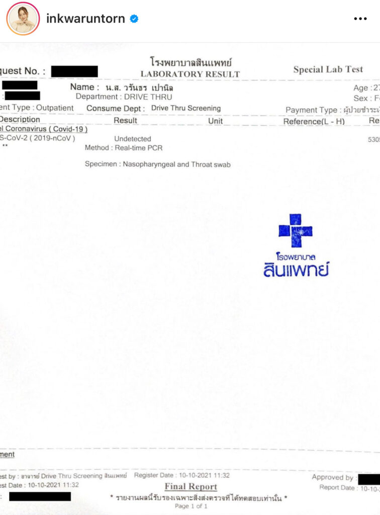 “อัปเดตผลการตรวจ RT-PCR ของอิ้งค์จากทางโรงพยาบาลสินแพทย์ รามอินทรา เมื่อวันที่ 10 ตุลาคม 2564 ผลออกมา “ไม่พบเชื้อ” แต่เพื่อความปลอดภัยของทุกฝ่าย จะทำการ Home Isolation เป็นเวลา 7 วัน และปฏิบัติตามคำแนะนำของแพทย์อย่างเคร่งครัดค่ะ อิ้งค์ขออภัยทุกฝ่ายที่เกี่ยวข้องและได้รับผลกระทบอีกครั้งและขอขอบคุณทุกคนที่เป็นห่วงนะคะ“