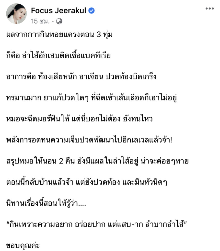 ทำเอาแฟนคลับเป็นห่วงหนักมากเมื่อนักแสดงสาวโฟกัส จีระกุลถูกห่ามส่งโรงพยาบาลเนื่องจากกินหอยแครงทำให้เกิดอาการท้องเสีย อาเจียน ท้องบิดเกร็งหนักมาก ซึ่งล่าสุดเจ้าตัวออกมาอัพเดทอาการว่าตอนนี้กลับบ้านได้แล้วแต่ยังปวดท้อง และมึนหัวนิดๆ โดยโพสต์ภาพพร้อมแคปชั่นว่า
