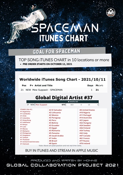 ทางด้านมิวเองก็เลยปล่อย Teaser MV มาให้ชมกันก่อน หลังจากได้สร้างสถิติใหม่ บนชาร์ทเพลงทั่วโลก ด้วยการพาเพลง “SPACEMAN” ขึ้นสู่อันดับ 1 ทันทีใน 16 โลเคชั่นทั่วโลก และยังติดชาร์ตอีกมากกว่า 44 โลเคชั่นทุบสถิติตอนปล่อยอัลบั้ม 365 พร้อมเข้าสู่อันดับ 21 ใน Worldwide iTunes Song Chart และยังติด TOP10 US iTunes Top Songs แถมยังติดอันดับ 37 Global Digital Artist