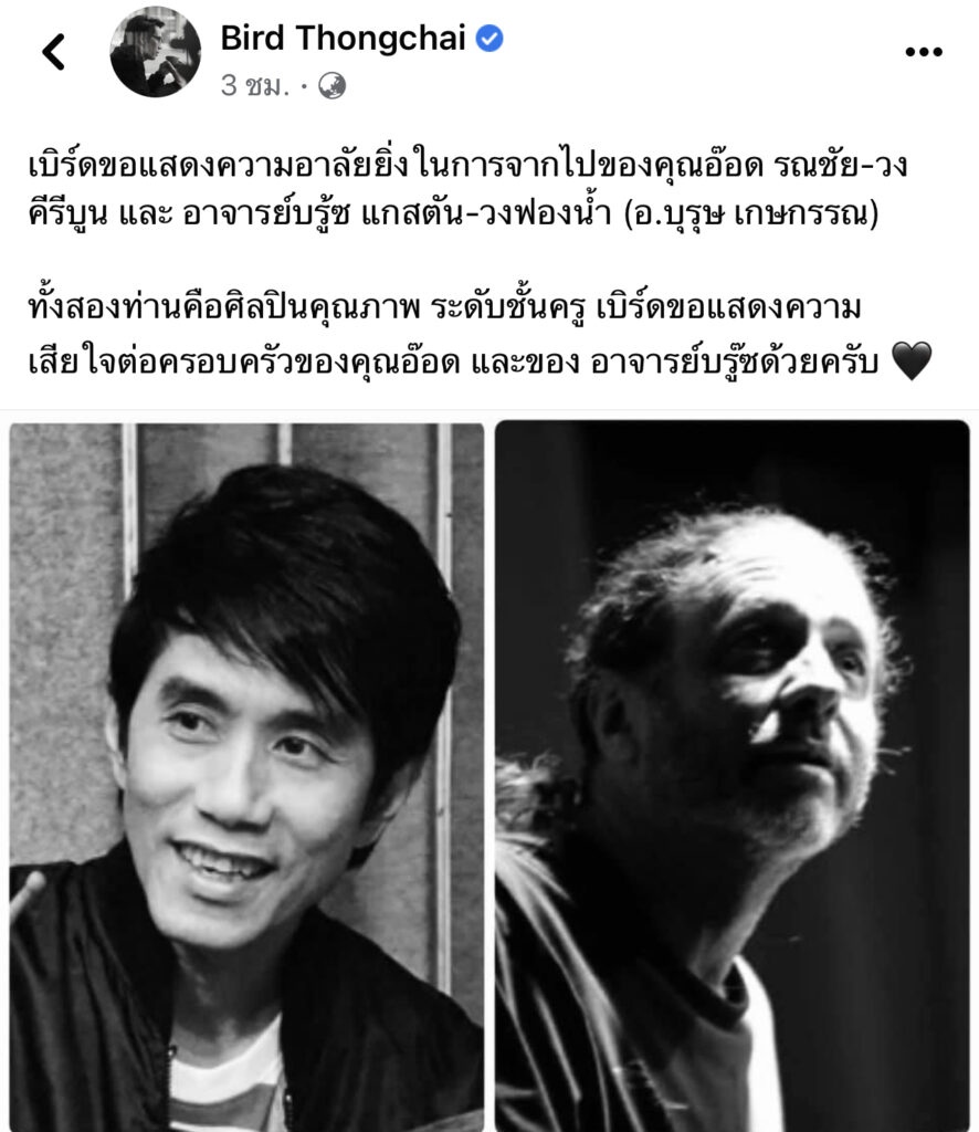 นักร้องดังหนุ่ม “เบิร์ด ธงไชย” ร่วมอาลัยหลังสูญเสีย “อ๊อด คีรีบูน“-“บรูซ แกสตัน“ลั่นทั้งสองท่านศิลปินคุณภาพ