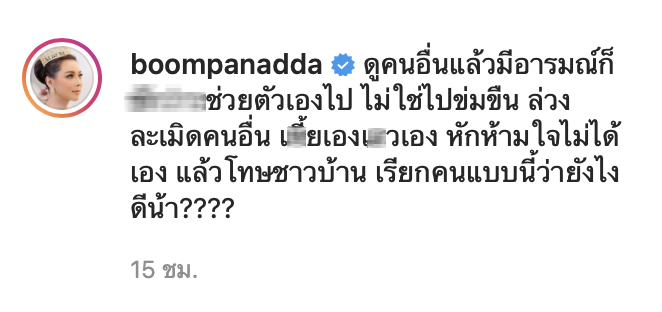 โดย บุ๋ม ปนัดดา ทำการแคปคอมเมนต์ดังกล่าวแล้วนำมาโพสต์ พร้อมเขียนแคปชั่นว่า “ดูคนอื่นแล้วมีอารมณ์ก็ชักว่าวช่วยตัวเองไป ไม่ใช่ไปข่มขืน ล่วงละเมิดคนอื่น เหี้xเองเลวเอง หักห้ามใจไม่ได้เอง แล้วโทษชาวบ้าน เรียกคนแบบนี้ว่ายังไงดีน้า ????”