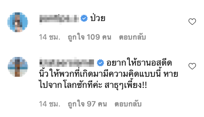 งานนี้คนดังในวงการหลายคน เช่น ปุ้มปุ้ย พรรณทิพา,กระแต อาร์สยามและ เมญ่า นนธวรรณ ก็ได้มาคอมเมนต์แสดงความคิดเห็นที่คิดตรงกันกับบุ๋มว่า “อยากให้ธานอสดีดนิ้วให้พวกที่เกิดมามีความคิดแบบนี้ หายไปจากโลกสักทีค่ะ สาธุ ๆ เพี้ยง !!”, “ป่วย”,”ตรรกะแบบ…..” แต่ละคนตัวแม่ทั้งนั้น