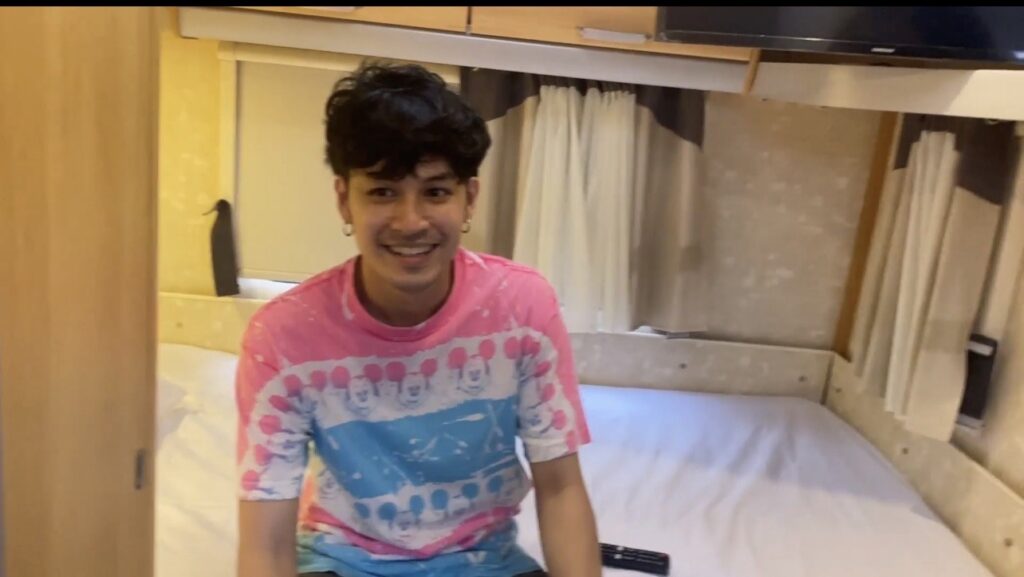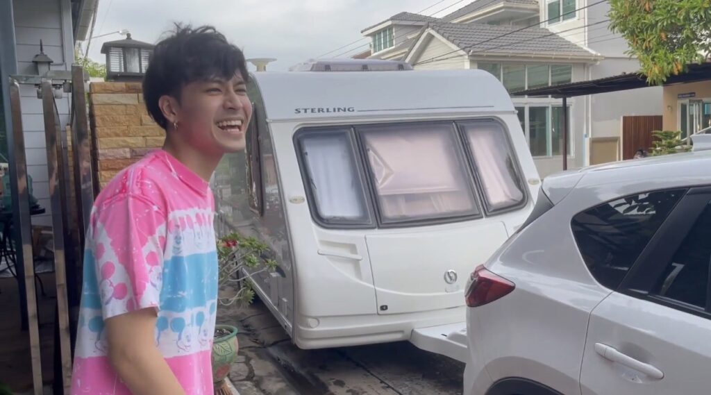 เก้า : และนี่ก็คือ รถบ้านที่ผมเป็นเจ้าของโดยไม่รู้ตัว เดี๋ยวเรามารีวิวในรถกัน ในรถก็จะมีเตียง ทีวี ห้องน้ำ ตู้เย็น ครบเลยครับ แต่ที่คือ ในรถบ้านมีเตาอบ (หัวเราะ) โอ้วโห … อยู่ในบ้านไม่มีเตาอบเลย แต่ในรถบ้านผมมีเตาอบ แต่ข้องใจอยู่อย่างหนึ่งคือ ผมได้ของขวัญหรือว่าแม่เขาซื้อให้ตัวเอง (แม่ก้อยกอดเก้า หัวเราะ)