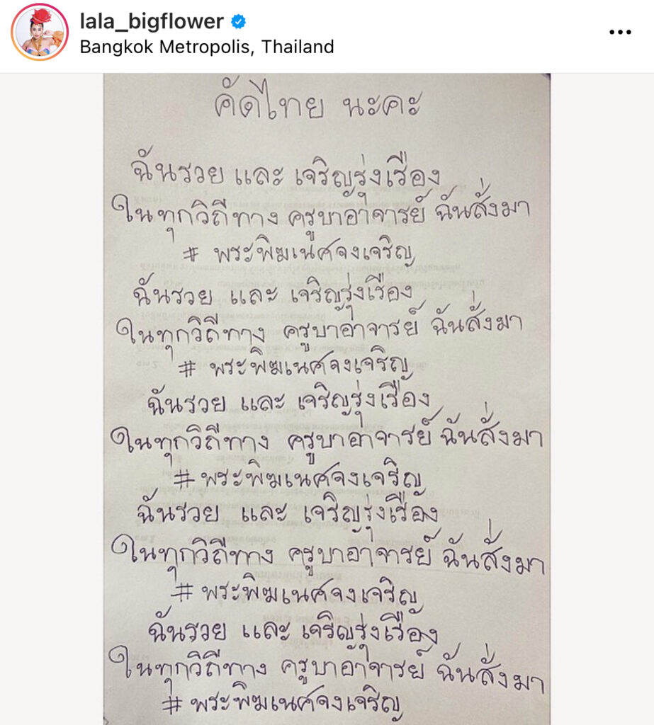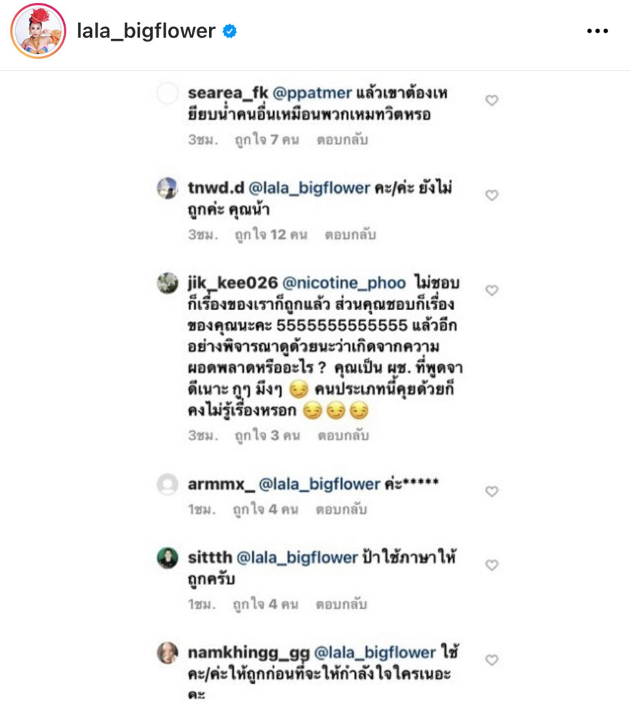 ซึ่งงานนี้เจ้าตัวทนไม่ไหว โพสต์ภาพคัดลายมือภาษาไทย พร้อมแคปชั่นสุดจิ๊ดว่า“เปลี่ยนจากคำว่า คะ/ค่ะ ที่เป็นปัญหาดราม่ากับลาล่าให้ถกเถียงกันตอนนี้ แล้วถ้าลาล่า เปลี่ยนมาเป็นภาษาบ้านตัวเอง เช่น สู้เด้อจ้า แม่นแล้วจ้า เป็นกำลังใจให้เด้อจ้า แบบนี้ ผิดหลักสากลมั๊ย หรือถูกต้องตามกฎที่พวกคุณตั้งไว้มั๊ย แค่ให้กำลังใจ ไม่ได้เขียนเรียงความภาษาไทย ต้องบูลลี่กันเรื่องใหญ่ขนาดนี้เลยหรา..ห๊าา!!😩😩 การใช้ภาษาไทย ที่ไม่ได้ไปประกวดเรียงความ หรืออาจใช้เป็นภาษาคาราโอเกะ ผิดถึงขนาดต้องไม่ชอบ หรือเกลียดกันเลยหรา ..และ การที่เราให้กำลังใจพี่ที่สนิท ผิดตรงไหน ในเมื่อเขาปรับปรุงตัวแล้ว จะต้องซ้ำเติมเขาหรือต้องเหยียบเขาให้จมดินหรา แน่ใจหราว่า สิ่งที่พวกคุณทำถูกต้องแล้ว ห๊าาา!!😩 ” โดยงานนี้ก็มีแฟนคลับเข้ามาให้กำลังใจสาวลาล่ากันสนั่นไอจี