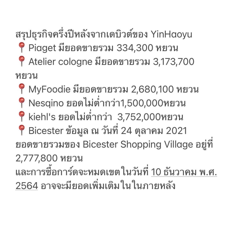 • ยอดขายรวมของ Bicester Shopping Village อยู่ที่ 2,777,800 หยวน และการซื้อการ์ดจะหมดเขตในวันที่ 10 ธันวาคมพ.ศ. 2564 อาจจะมียอดเพิ่มเติมในในภายหลัง