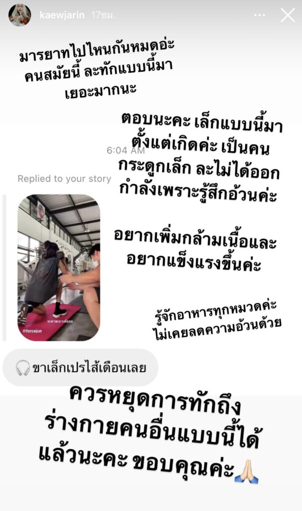 “ขอบคุณสำหรับกำลังใจที่ ทุกคนส่งมานะคะ และเห็น ได้เลยว่าคนโดนแบบเรากันเยอะมาก เรื่องการทักถึงร่างกายคนอื่นแบบไม่มี มารยาทไม่ควรเป็นเรื่องปกติได้แล้วนะคะ”