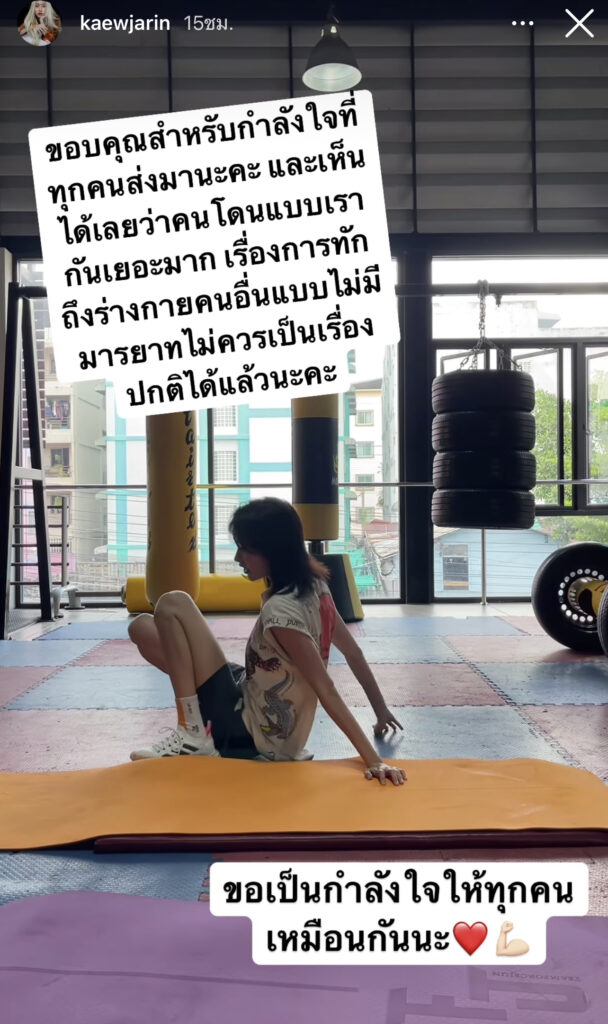 ซึ่งเวลาต่อมาสาวแก้วก็ได้โพสต์ภาพอีกครั้ง เป็นภาพขณะออกกำลังกาย พร้อมเขียนข้อความว่า