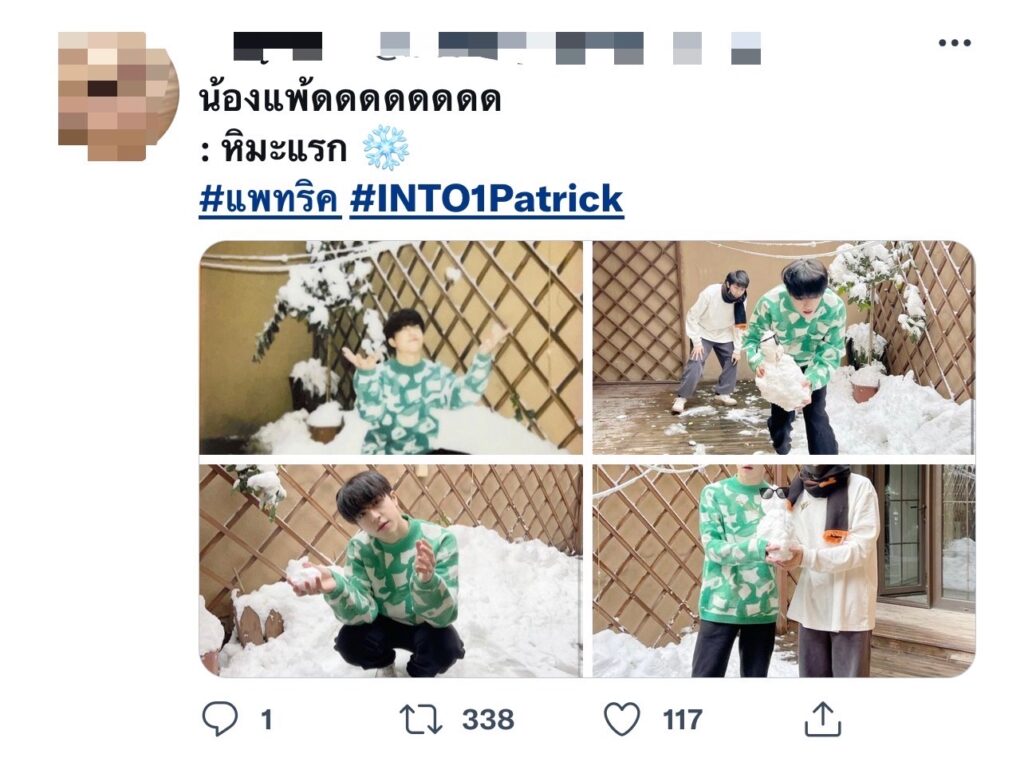 ล่าสุดเมื่อเริ่มก้าวเข้าสู่หน้าหนาวที่ประเทศจีน ก็ทำให้อากาศเย็นจนหิมะตก งานนี้หนุ่ม “แพทริค” ก็เลยขอถือโอกาสออกมาสัมผัสเจ้าหิมะสีขาวแสนเย็นฉ่ำ ซึ่งทาง “แพทริค” ก็ได้โพสต์รูปรัวๆ ถึง 5 รูป กับหิมะแรกที่ได้ชวน“หลินโม่” เพื่อนร่วมวงมาเล่นหิมะด้วย งานนี้ส่งผลให้แฮชแท็ก #INTO1Patrick และ #แพทริค ทยานเทรนด์ฮิตอันดับ1 และ 2 บนทวิตเตอร์อีกด้วย