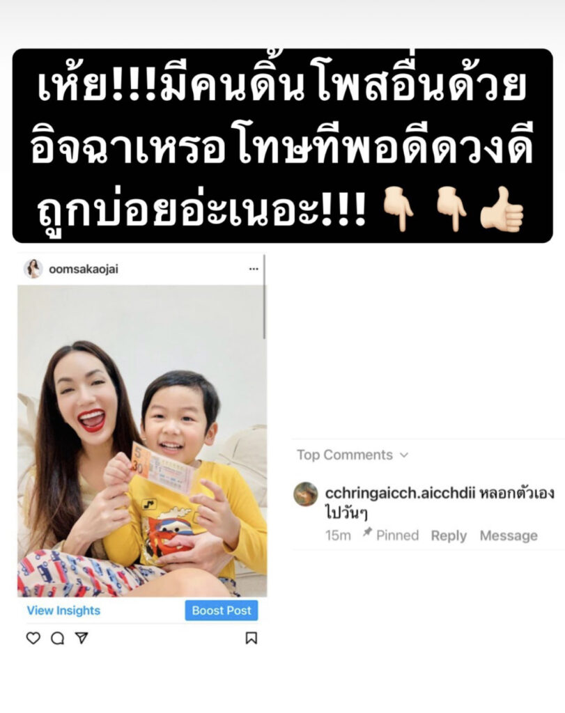 ซึ่งงานนี้พอสาวอ๋อมอ่านก็แอบมีเคือง เลยขอแคปข้อความดังกล่าวพร้อมเขียนแคปชั่นว่า“เห้ย มีคนดิ้นโพสต์อื่นด้วย อิจฉาเหรอ โทษทีพอดีดวงดีถูกบ่อยอ่ะเนอะ” เรียกได้ว่าฟาดกลับแบบจุกๆ สมฉายาคุณแม่อ๋อมจริงๆจ้า ซึ่งงานนี้ก็มีแฟนคลับเข้ามาวิจารณ์ชาวเน็ตรายดังกล่าวว่าไม่มีมารยาทในสังคมมาก