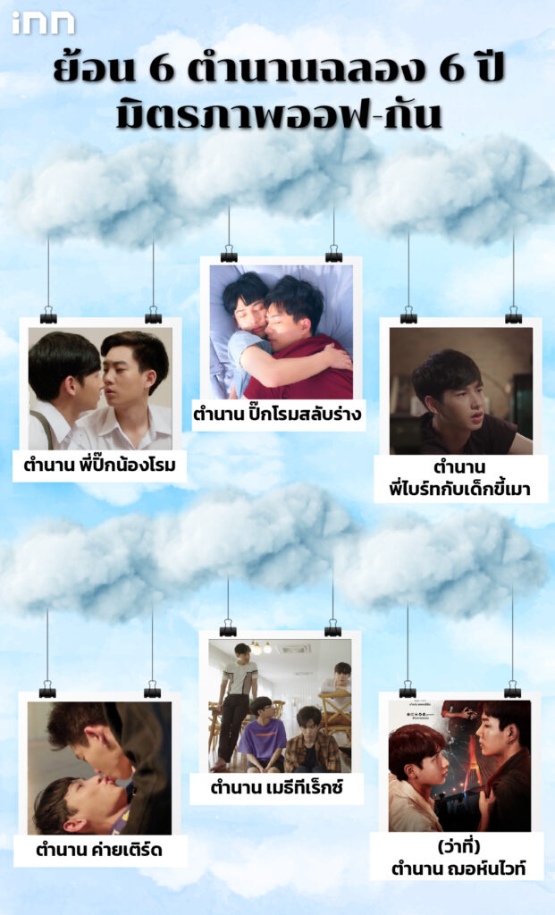 ยังคงมีโมเมนต์ต่อเนื่องสำหรับคู่จิ้นวายระดับตำนานของตึก GMM ออฟ-กัน ถ้านับตั้งแต่ครั้งแรกที่เจอหน้ากัน วันนี้ก็เป็นวันครบรอบ 6 ปีที่คุณพี่มาดกวน ‘ออฟ จุมพล’ หรือป่าปี๊ของน้องหนูแคระ ‘กัน อรรถพันธ์’ จนแฟนคลับของทั้งคู่อย่าง ‘เบบี๋’ ติด #OffGun6thYearsofLove จนติดเทรนต์ทวิตเตอร์ วันนี้ iNN เลยชวนย้อนรอยตำนาน 6 บทบาทตำนาน ตลอด 6 ปีของทั้งคู่มาให้ฟินกัน