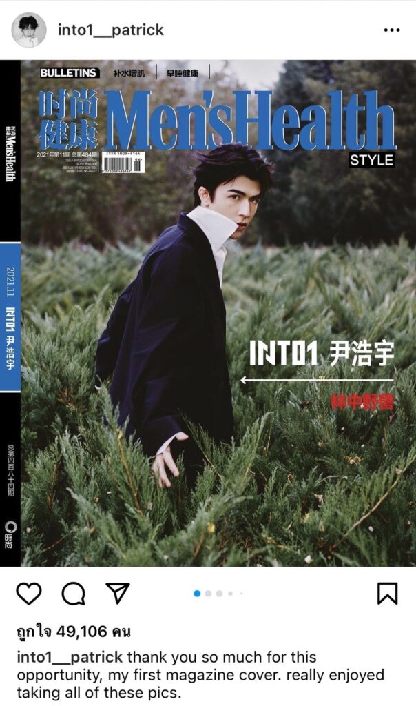 และล่าสุด “แพทริค” ได้โพสต์ภาพเพิ่มเติมในนิตยสารลงอินสตาแกรมส่วนตัว @into1__patrick เป็นภาพที่เจ้าตัวอยู่ในเมืองที่เต็มไปด้วยป่าไม้สีเขียวขจีที่มีความอุดมสมบูรณ์ พร้อมแคปชั่นระบุว่า “thank you so much for this opportunity, my first magazine cover. really enjoyed taking all of these pics.” (ขอบคุณมากสำหรับโอกาสนี้นิตยสารฉบับแรกของฉัน สนุกกับการถ่ายรูปทั้งหมดนี้จริงๆ)