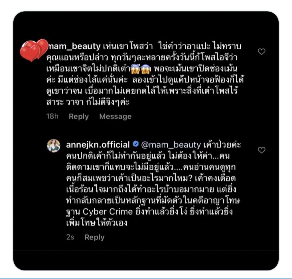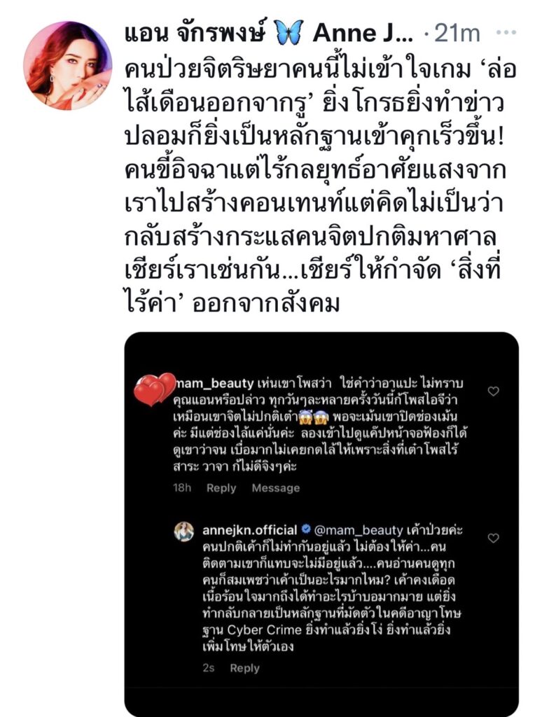 ล่าสุด แอน-จักรพงษ์ มีผู้หวังดีเข้ามาคอมเมนต์ในอินสตาแกรม เห็นว่าฝั่งคู่กรณี พยายามโพสต์ที่ดูเหมือนโยงถึงแอน แต่ปิดช่องคอมเมนต์ ซึ่งเป็นสิ่งที่ไร้สาระ วาจาก็ไม่ดี งานนี้ “แอน” จึงเข้าไปตอบกลับว่า “เค้าป่วยค่ะ คนปกติเค้าก็ไมทำกันอยู่แล้ว คนอ่านคนดูทุกคนก็สมเพชว่าเค้าเป็นอะไรมากไหม? เค้าคงเดือดร้อนใจมากถึงได้ทำอะไรบ้าบอมากมาย แต่ยิ่งทำกลับกลายเป็นหลักฐานที่มัดตัวในคดีอาญาโทษฐาน Cyber Crime ยิ่งทำแล้วยิ่งโง่ ยิ่งทำแล้วยิ่งเพิ่มโทษให้ตัวเอง” อีกทั้ง “แอน” ยังแคป ข้อความดังกกล่าวในไอจี มาทวีตในทวิตเตอร์ ว่า “คนป่วยจิตริษยาคนนี้ไม่เข้าใจเกม ‘ล่อไส้เดือนออกจากรู’ ยิ่งโกรธยิ่งทำข่าวปลอมก็ยิ่งเป็นหลักฐานเข้าคุกเร็วขึ้น! คนขี้อิจฉาแต่ไร้กลยุทธ์อาศัยแสงจากเราไปสร้างคอนเทนท์แต่คิดไม่เป็นว่ากลับสร้างกระแสคนจิตปกติมหาศาลเชียร์เราเช่นกัน…เชียร์ให้กำจัด ‘สิ่งที่ไร้ค่า’ ออกจากสังคม”