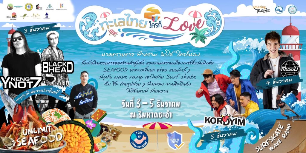 ททท.ร่วมกับเทศบาลเมืองชะอำ มอบความสุข งาน“ทะเลไทย ใครก็ LOVE” กิจกรรมกินชิมริมทะเล กิจกรรมอาหารท้องถิ่นขนมหวานเมืองเพชรและออกร้านชุมชน กิจกรรมการแสดงพื้นบ้านวัฒนธรรมไทย รวมถึงกิจกรรมชิลริมทะเลกับฟรีคอนเสิร์ตจากศิลปินชื่อดังมากมาย และกิจกรรมแบก Surf Skate มาเที่ยวเฟี้ยวชะอำ ณ ริมหาดสาธารณะ ต.ชะอำ อ.ชะอำ จ.เพชรบุรี ในวันที่ 3-5 ธันวาคม 2564 ตั้งแต่เวลา 16.00 – 22.00 น. งานนี้ค่าย Khoasan Entertainment เป็นผู้ร่วมสนับสนุน งาน “ทะเลไทย ใครก็ LOVE” และ ส่งศิลปินร็อคระดับตำนานวง BLACKHEAD ขึ้นเวทีจัดหนักจัดเต็มเพลงเพราะๆ ให้แฟนๆ ได้สนุกร่วมกันในบรรยากาศ ริมทะเลสุดฟินอีกด้วย..