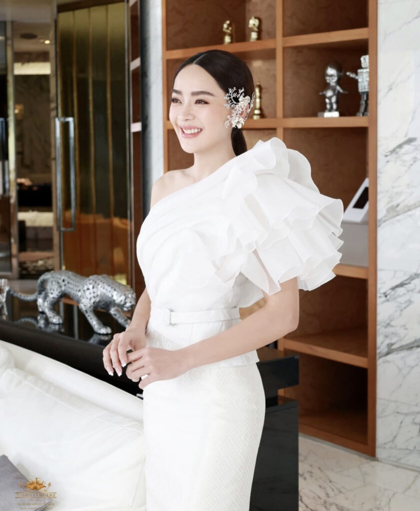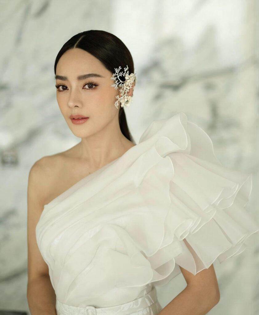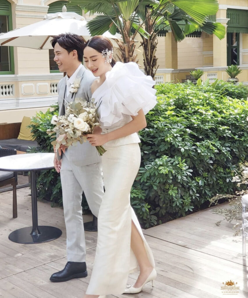โดยสาวปุยฝ้ายมาในลุคสวมชุดไทยสวยง่า ออร่าเจ้าสาวเจิดจรัสที่ได้น้องฉัตรมือทองของเมืองไทยมาช่วยแปลงโฉมในครั้งนี้ทำให้ออกมาสวยสง่าเกินคำบรรยายสุดๆ ส่วนเจ้าบ่าวมาในลุคเรียบหรูดูแพงชุดสูทผู้ชายสไตล์อังกฤษทรงสลิมฟิต มาพร้อมเสื้อกั๊ก สีเทาสว่างเข้ากันทั้งชุด ทำให้ลุคนี้ออกมาคอมพลีสสุดๆ ซึ่งงานนี้ก็มีแฟนคลับร่วมถึงเพื่อนดาราต่างเข้ามาแสดงความยินดีกับทั้งคู่กันอย่างล้นหลาม