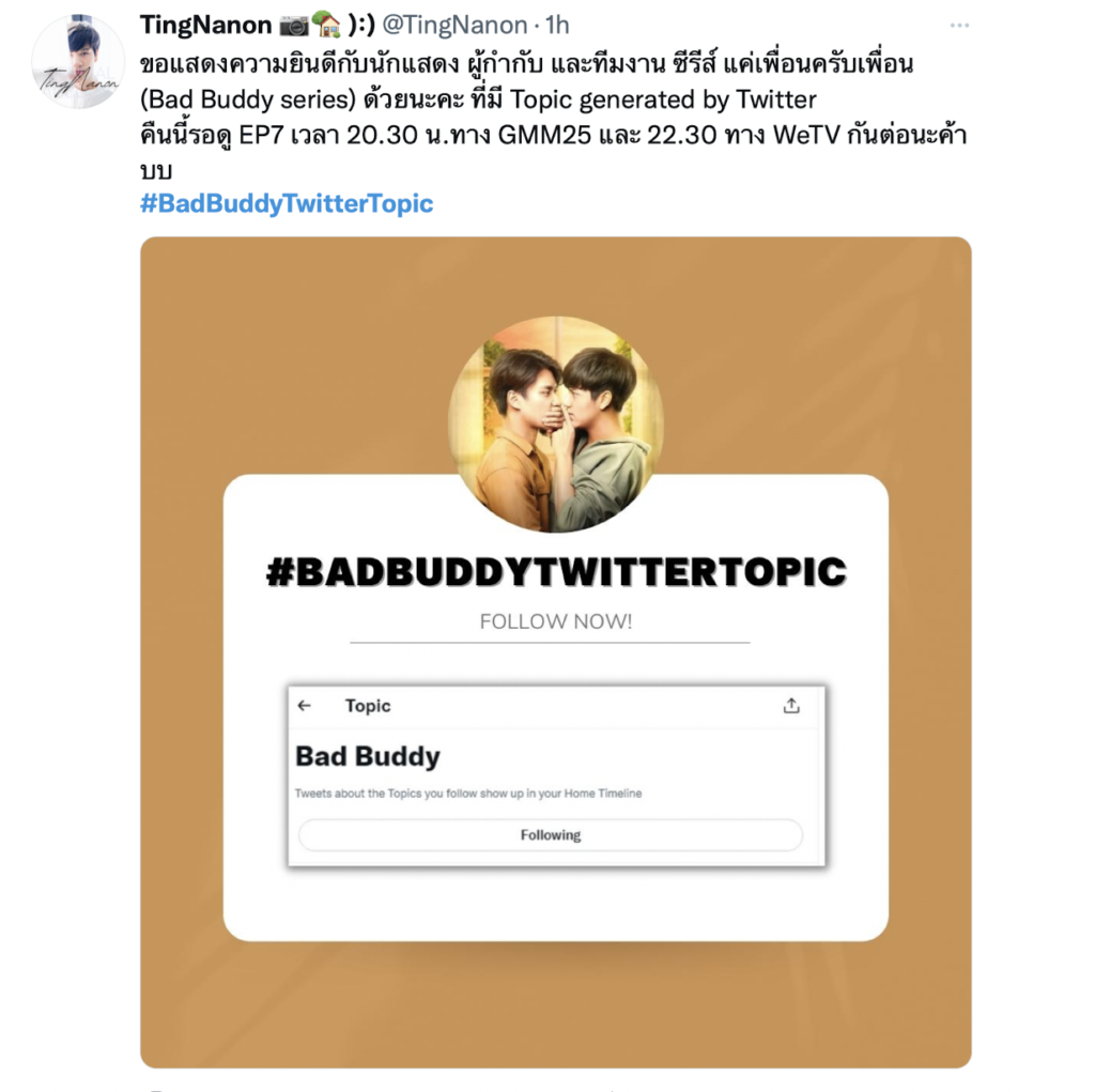 โดย Twitter Topic เป็นฟีเจอร์ใหม่ไว้สำหรับติดตามสิ่งที่สนใจและชื่นชอบ เมื่อกดติดตามแล้วหน้าทามไลน์ก็จะมีข้อความเกี่ยวกับประเด็นนั้นออกมาเรื่อยๆ หลังจากทวิตเตอร์ประกาศปุ๊บ เหล่าคนดูทั้งสาววายและแฟนคลับก็ชวนกันจุด #BadBuddyTwitterTopic จนติดเทรนด์อันดับ 1 รวมถึงออกมาขอบคุณทวิตเตอร์และแห่แชร์โมเมนต์หวานชวนวอร์มนิ้วจิกหมอนรอซีรีส์ฉายคืนนี้