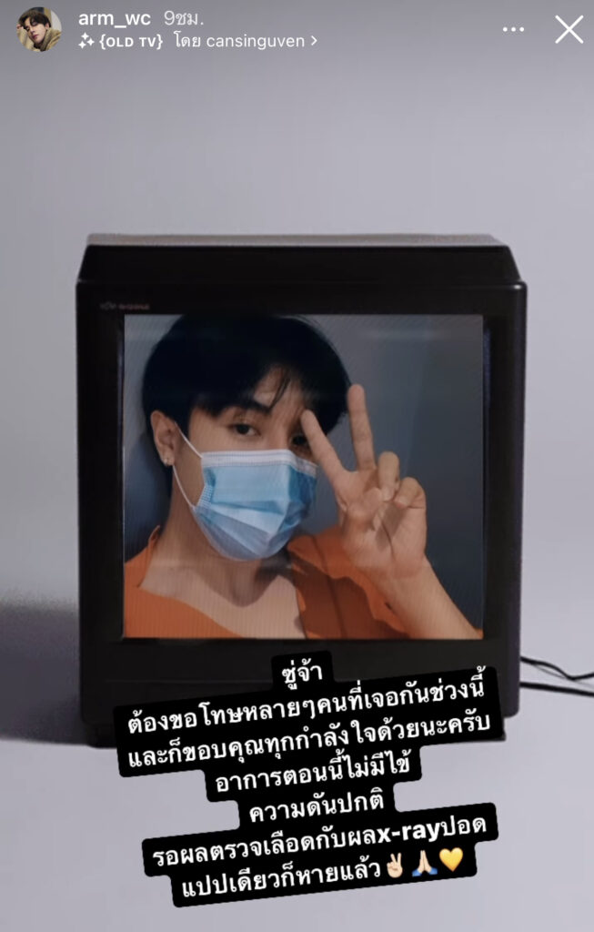 ซึ่งเวลาต่อมาหนุ่มอาร์มได้ออกมาโพสต์ภาพตัวเองผ่านไอจีสตอรี่ว่า“ต้องขอโทษหลายๆคนที่เจอกันช่วงนี้และต้องขอขอบคุณทุกกำลังใจด้วยนะ อาการตอนนี้ไม่มีไข้ ความดันปกติ รอผลตรวจเลือดกับผลx-rayปอด แปปเดียวก็หายแล้ว“ซึ่งงานนี้ก็มีแฟนคลับเข้ามาส่งกำลังใจให้หนุ่มอาร์มหายไวๆกันอย่างล้นหลาม