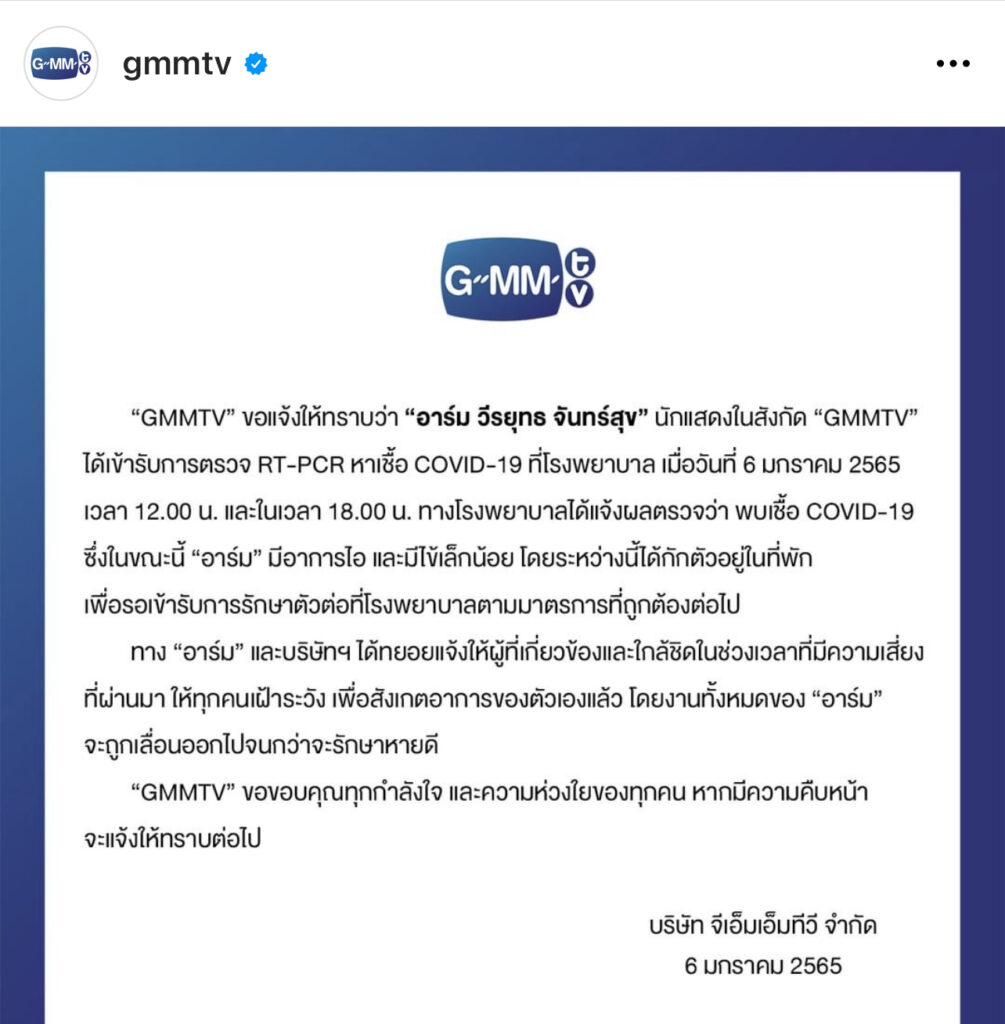 “GMMTV ขอแจ้งให้ทราบว่า อาร์ม วีรยุทธ จันทร์สุข นักแสดงในสังกัด GMMTV ได้เข้ารับการตรวจ RT-PCR หาเชื้อ COVIE-19 ที่โรงพยาบาล เมื่อวันที่ 6 มกราคม 2565 เวลา 12.00 น. และ ในเวลา 18.00 น. ทางโรงพยาบาลได้แจ้งผลตรวจว่า พบเชื้อ COVID-19 ซึ่งในขณะนี้ อาร์ม มีอาการไอ และมีไข้เล็กน้อย โดยระหว่างนี้ได้กักตัวอยู่ในที่พักเพื่อรอเข้ารับการรักษาตัดต่อที่โรงพยาบาลตามมาตรการที่ถูกต้องต่อไป