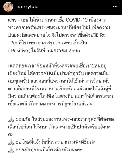 (แต่ตลอดเวลาก่อนหน้าที่จะตรวจพบเชื้อ เรา 2 คนอยู่เชียงใหม่ ได้ตรวจ ATK เป็นประจำทุกวัน ผลตรวจเป็นลบทุกครั้ง” และตอนนี้แพร – เชน ได้เข้าทำการรักษาตัวตามขั้นตอนที่โรงพยาบาลเรียบร้อยแล้วและได้แจ้งผู้ที่มีความเกี่ยวข้องใกล้ชิดในช่วงที่ผ่านมาให้เข้าตรวจหาเชื้อและกักตัวตามมาตรการที่ถูกต้องแล้วค่ะ