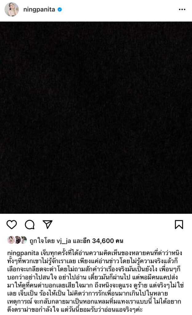 “เจ็บทุกครั้งที่ได้อ่านความคิดเห็นของหลายคนที่ด่าว่าหนิง ทั้งๆ ที่พวกเขาไม่รู้จักเราเลย เพียงแค่อ่านข่าวโดยไม่รู้ความจริงแล้วก็เลือกจะเกลียดจะด่าโดยไม่ถามสักคำว่าเรื่องจริงมันเป็นยังไง เพื่อนๆ ก็บอกว่าอย่าไปสนใจ อย่าไปอ่าน เดี๋ยวมันก็ผ่านไป แต่พอมีคนแคปส่งมาให้ดูที่คนด่าบอกเลยเสียใจมาก ถึงหนิงจะดูแรง ดูร้าย แต่จริงๆ ไม่ใช่เลยเจ็บเป็น ร้องไห้เป็น ไม่คิดว่าการรักเพื่อนมากเกินไปในหลายเหตุการณ์ จะกลับกลายมาเป็นหอกแหลมทิ่มแทงเราแบบนี้ ไม่ได้อยากดึงดราม่าขอกำลังใจ แต่วันนี้ยอมรับว่าอ่อนแอจริงๆ ค่ะ”