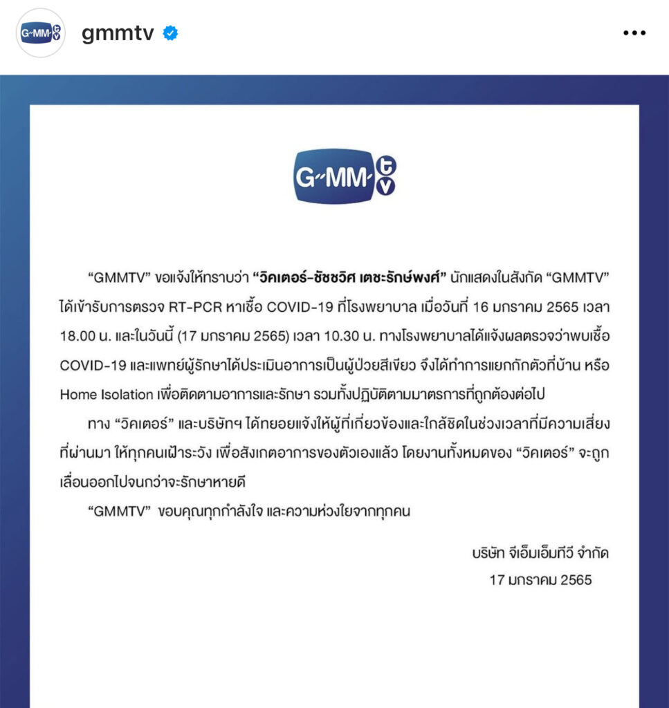 โดยได้โพสต์ข้อความข่าวสารผ่านไอจีว่า“GMMTV” ขอแจ้งให้ทราบว่า “วิคเตอร์ ชัชชวิศ เตชะรักษ์พงศ์” นักแสดงในสังกัด “GMMTV” ได้เข้ารับการตรวจRT-PCR หาเชื้อ COVID-19 ที่โรงพยาบาลเมื่อวันที่ 16 มกราคม 2565 เวลา 18.00 น. และในวันที่ (17 มกราคม 2565) เวลา 10.30 น. ทางโรงพยาบาลได้แจ้งผลตรวจว่าพบเชื้อ COVID-19 และแพทย์ผู้รักษาได้ประเมินอาการเป็นผู้ป่วยสีเขียว จึงได้ทำการแยกกักตัวที่บ้าน หรือ Home Isolation เพื่อติดตามอาการและรักษา รวมทั้งปฏิบัติตามมาตราการที่ถูกต้องต่อไป