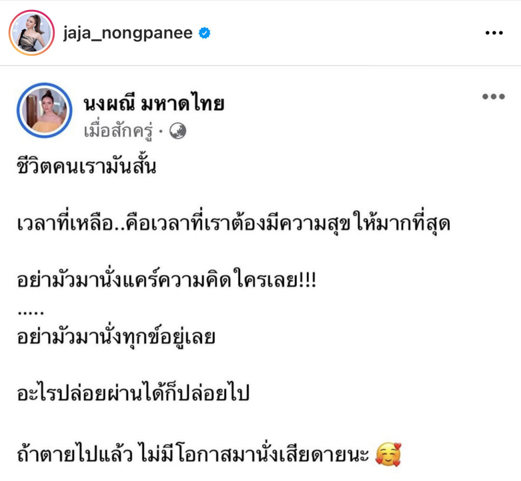 “ชีวิตคนเรามันสั้น เวลาที่เหลือ คือเวลาที่เราต้องมีความสุขให้มากที่สุด อย่ามัวมานั่งแคร์ความคิดใครเลย อย่ามัวมานั่งทุกข์เลย อะไรปล่อยผ่านได้ก็ปล่อยไป ถ้าตายไปแล้ว ไม่มีโอกาสมานั่งเสียดายนะ“พร้อมแคปชั่นว่า“โตขึ้น ความคิด ก็โตขึ้นตาม” แหมๆทำเอาขาเผือกสะดุ้งอยากรู้ว่ากันสนั่นว่าสาวจ๊ะไปเจออะไรมาถึงได้ฟาดคำคมได้แซ่บขนาดนี้ แต่ถ้ามองอีกมุมก็เรียกว่าเป็นคำคมที่เตือนสติทุกคนได้ดีมากจริงๆ