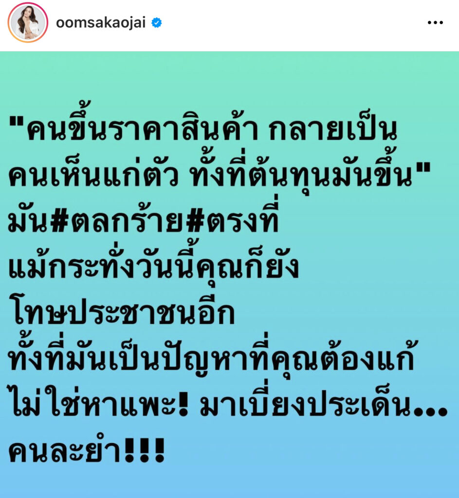 แรงดีไม่ตก! นักแสดงสาว“อ๋อม สกาวใจ“ซัดแหลกหลังราคาสินค้าขึ้น วอนหยุดโทษประชาชน ขอร้องอย่าหาแพะ
