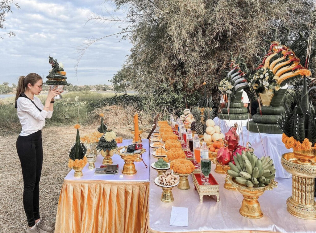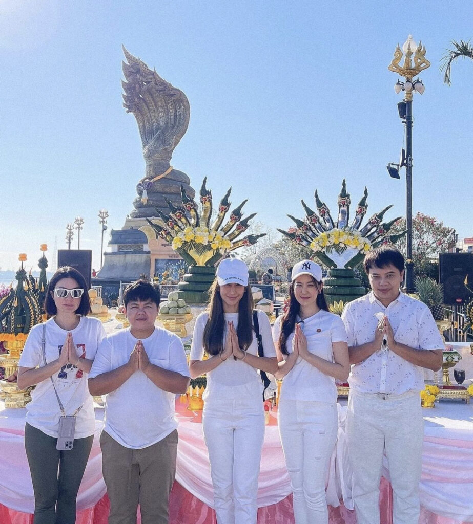2. พิธีบวงสรวง ที่เนยทำทุกคนสามารถทำได้นะคะ ที่คำชะโนด , ปู่อือลือกลางน้ำ , ลานพญาศรีสัตนาคราช หลังจากบวงสรวงเสร็จแล้วก็แจกจ่ายของไหว้กับชาวบ้านระแวกนั้น มีชาวบ้านมารอรับของไหว้ และอนุโมทนาสาธุไปกับเราไม่น่าจะมีอะไรนะคะ“