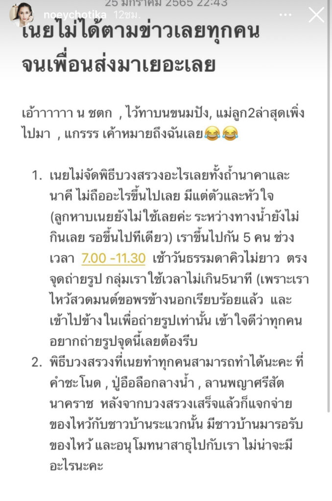 ซึ่งงานนี้ก็ทำเอาชาวเน็ตต่างสืบกันต่อว่าเป็นใครสุดท้ายมาออกที่คุณแม่ลูกสองสาว“เนย โชติกา“โดยสาวเนยก็ไม่ปล่อยให้คนสงสัยนานรีบออกมาชี้แจงเขียนข้อความผ่านไอจีสตอรี่ว่า” เนยไม่ได้ตามข่าวเลยทุกคน จนเพื่อนส่งมาเยอะเลย เอ้าาาาาา น ชตก , ไว้ทาบนขนมปัง , แม่ลูก 2 ล่าสุดเพิ่งไปมา , แกรรรเขาหมายถึงฉันเลย