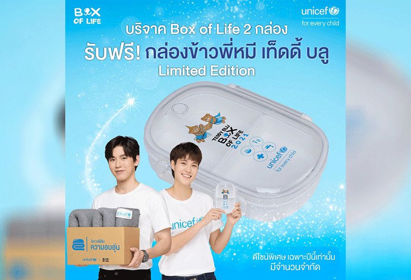 ตามที่ องค์การยูนิเซฟ ประเทศไทย ได้ร่วมกับเหล่าศิลปินและนักแสดงชื่อดัง อาทิ นาย – ณภัทร เสียงสมบุญ, แหม่ม – คัทลียา แมคอินทอช, หมอเจี๊ยบ – ลลนา ก้องธรนินทร์ และ นิว – ฐิติภูมิ เตชะอภัยคุณ เปิดตัวแคมเปญ “BOX OF LIFE”  ชวนคนไทยช่วยเหลือเด็ก ๆ ด้วยการเพิ่มโอกาสการมีชีวิตรอดให้กับพวกเขาเมื่อช่วงปลายปี 2563 ที่ผ่านมา และได้รับกระแสตอบรับอย่างดีจากคนไทยทั้งประเทศ ร่วมกันสนับสนุนกล่อง BOX OF LIFE ที่บรรจุสิ่งของบรรเทาทุกข์ อาทิ อาหารบำบัดฉุกเฉิน เม็ดทำน้ำสะอาด ผ้าห่มและอุปกรณ์กันหนาว วัคซีนป้องกันโรคบาดทะยัก และกล่องเพื่อช่วยให้เด็ก ๆ ในประเทศไทยให้เข้าถึงการศึกษาที่มีคุณภาพ เพื่อส่งต่อไปความช่วยเหลือไปยังเด็ก ๆ ที่กำลังเผชิญความเดือดร้อนอยู่ทั่วโลก  โดยแต่ละกล่องมีมูลค่ากล่องละ 750 บาท ทุกการบริจาค 2 กล่อง ผู้บริจาคจะได้รับกล่องข้าวเท็ดดี้ บลู ลิมิเต็ด อิดิชั่นจำนวน 1 กล่อง (จำนวนจำกัด) หรือสามารถบริจาคแบบระบุจำนวนเงินตามความประสงค์ แม้ความช่วยเหลือจะถูกส่งไปยังเด็ก ๆ จำนวนมากและทำให้พวกเขามีชีวิตความเป็นอยู่ที่ดีขึ้น แต่ยังคงมีเด็ก ๆ อีกหลายล้านคนทั่วโลกยังรอคอยความช่วยเหลืออยู่ ผู้ที่สนใจสามารถร่วมสนับสนุนเพิ่มเติมได้ด้วยการบริจาคในแคมเปญ BOX OF LIFE  ผ่านทาง https://www.unicef.or.th/boxoflife หรือค้นหาคำว่า UNICEF BOX OF LIFE